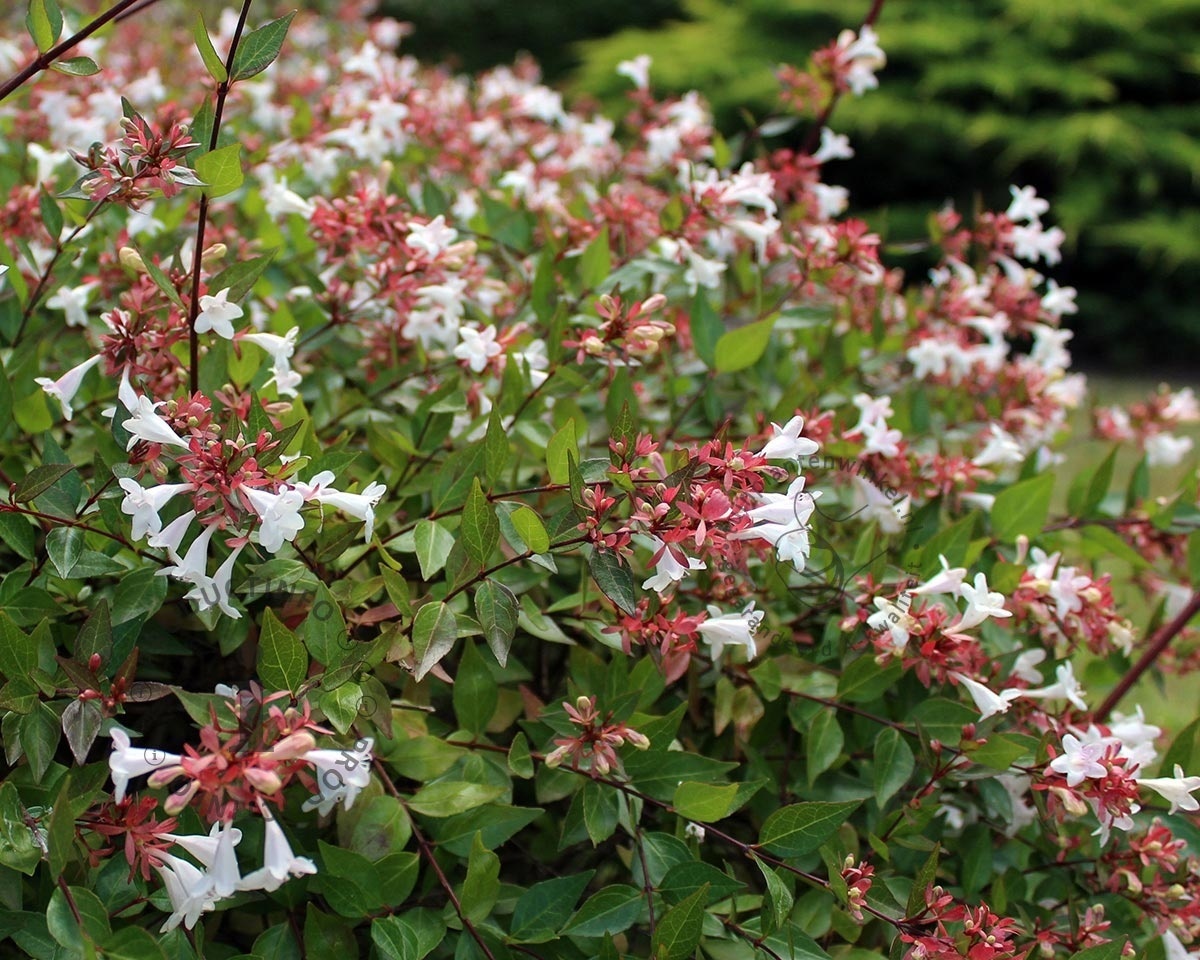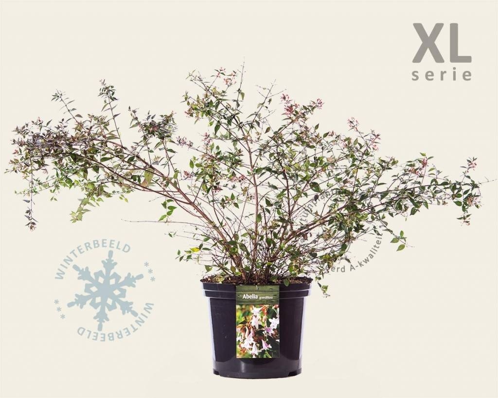 Abelia grandiflora XL is een langbloeiende heester. 'Grandiflora' is waarschijnlijk de meest populaire variant. Deze sierlijke tuinplant blijft half wintergroen. Het blad is glanzend donkergroen. Tijdens de bloei, van juni tot oktober, krijgt Albelia grandiflora bleek witroze, licht geurende, trompetachtige bloemen aan de gebogen takken. Hij staat mooi als solitair achterin een border of in kleine groepjes in een grotere border.