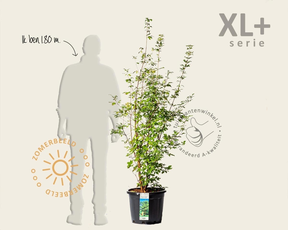 De Papieresdoorn in de XL+ uitvoering begint al het karakter te krijgen van een meerstammige boom. Acer griseum is een kleine, traag groeiende boomsoort die uitgroeit tot een hoogte van 3 tot 5 meter. De opvallende, afschilferende takken en bast zorgen ook in de wintermaanden voor een aantrekkelijk beeld. Deze Acer-variant is dan ook één van de mooiste esdoornsoorten. In het voorjaar verschijnt het, voor een Esdoorn zijnde, wat kleine en diep ingesneden blad. Het blad heeft in de zomer een groene kleur en verkleurt in het najaar vaak oranje of rood. Al deze eigenschappen zorgen ervoor dat de Acer griseum een prachtige tuinplant is.