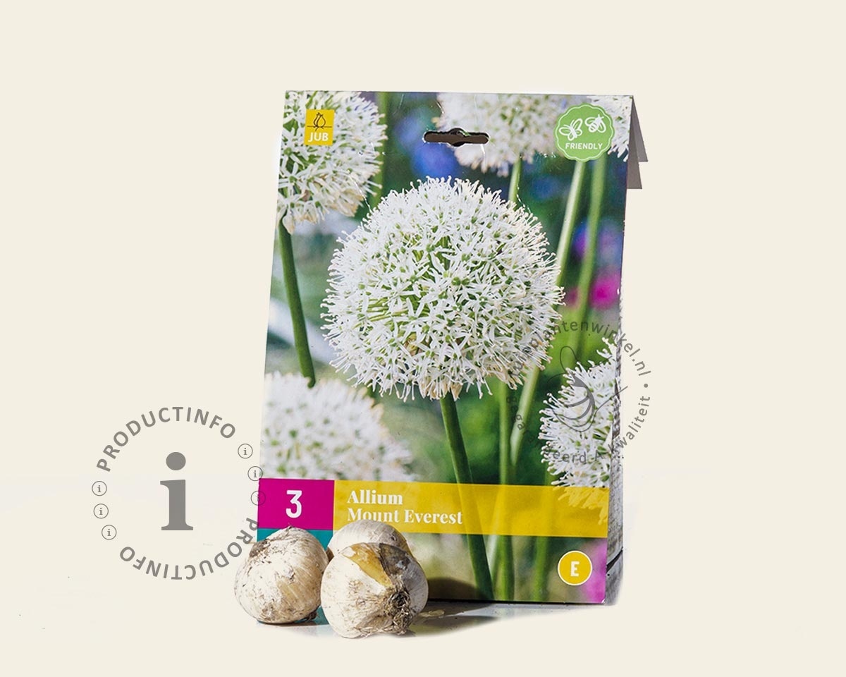De Allium 'Mount Everest' staat graag in een bodem die goed waterdoorlatend is, want de bollen houden niet van natte voeten. De grond moet goed humusrijk zijn. De plant staat graag in de zon of half schaduw. De bloembollen kunnen gewoon in de grond blijven zitten in de winter. Het product kan in de herfst tot december worden aangeplant. De plantdiepte is 15 cm gemeten vanaf de onderkant van de bol.