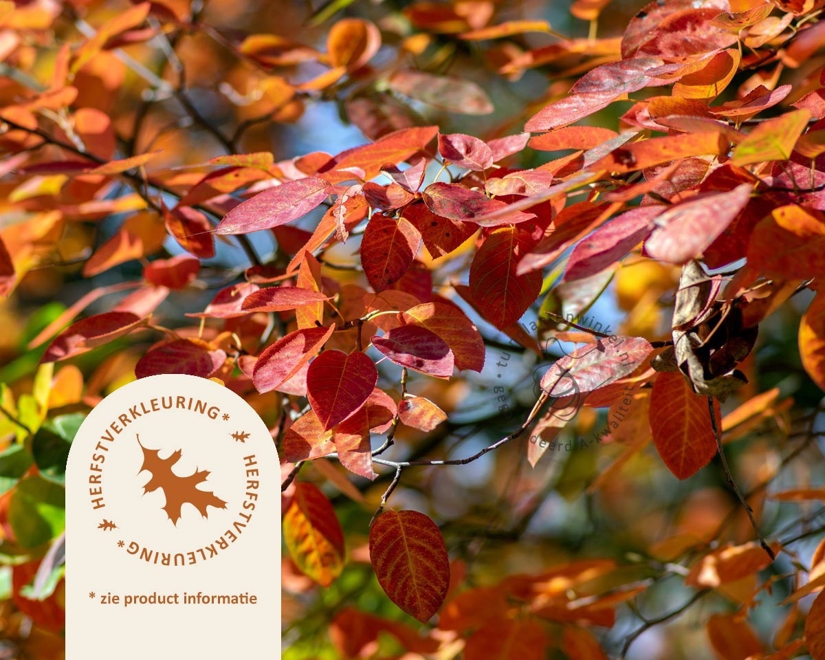 Het blad van deze plant verkleurt in het najaar. De kleuren op de foto geven een indicatie van deze verkleuring. De exacte verkleuring is afhankelijk van de standplaats en het weer en kan per jaar verschillen. Het is dus niet zeker of u de verkleuring zoals deze gefotografeerd is, ook terugziet in uw tuin. Aan de kleuren die op deze foto zichtbaar zijn, kunnen geen rechten worden ontleent.
