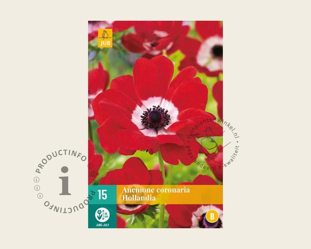De Anemone coronaria 'Hollandia', ook wel bekend als de kroonanemoon, is een ware schoonheid in de lentetuin. Met haar opvallende, dieprode bloemen met een zwart hart, brengt ze een explosie van kleur en energie. Deze plant is bij uitstek geschikt voor perken, borders, en ook als snijbloem in boeketten.