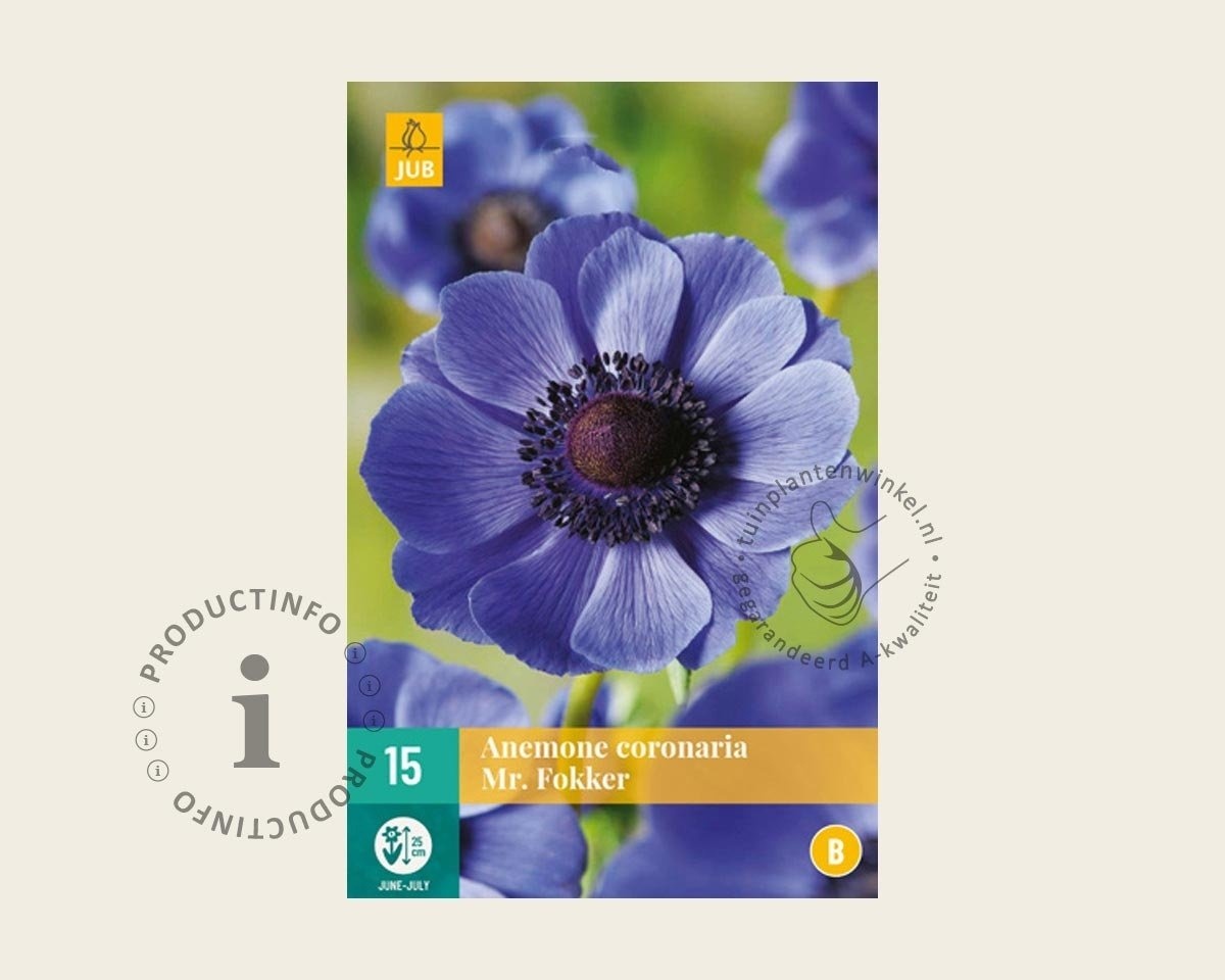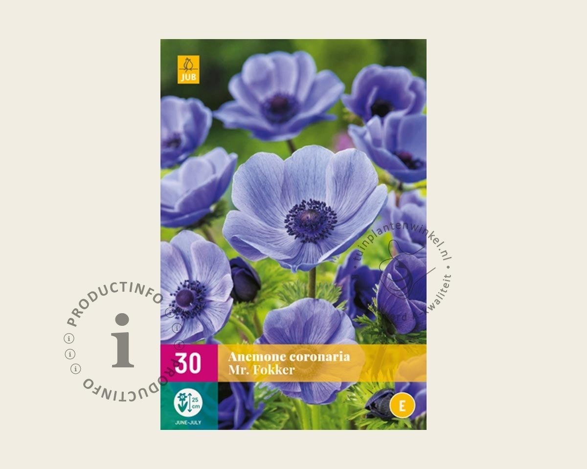 De Anemone coronaria 'Mr. Fokker' is een betoverende plant die bekend staat om zijn diepblauwe, bijna purperachtige bloemen. Deze anemoon soort, vaak aangeduid als kroonanemoon, is een populaire keuze voor tuiniers die op zoek zijn naar een levendige kleurenexplosie in hun tuin. Met zijn opvallende bloesems en elegante voorkomen, is 'Mr. Fokker' een echte blikvanger.