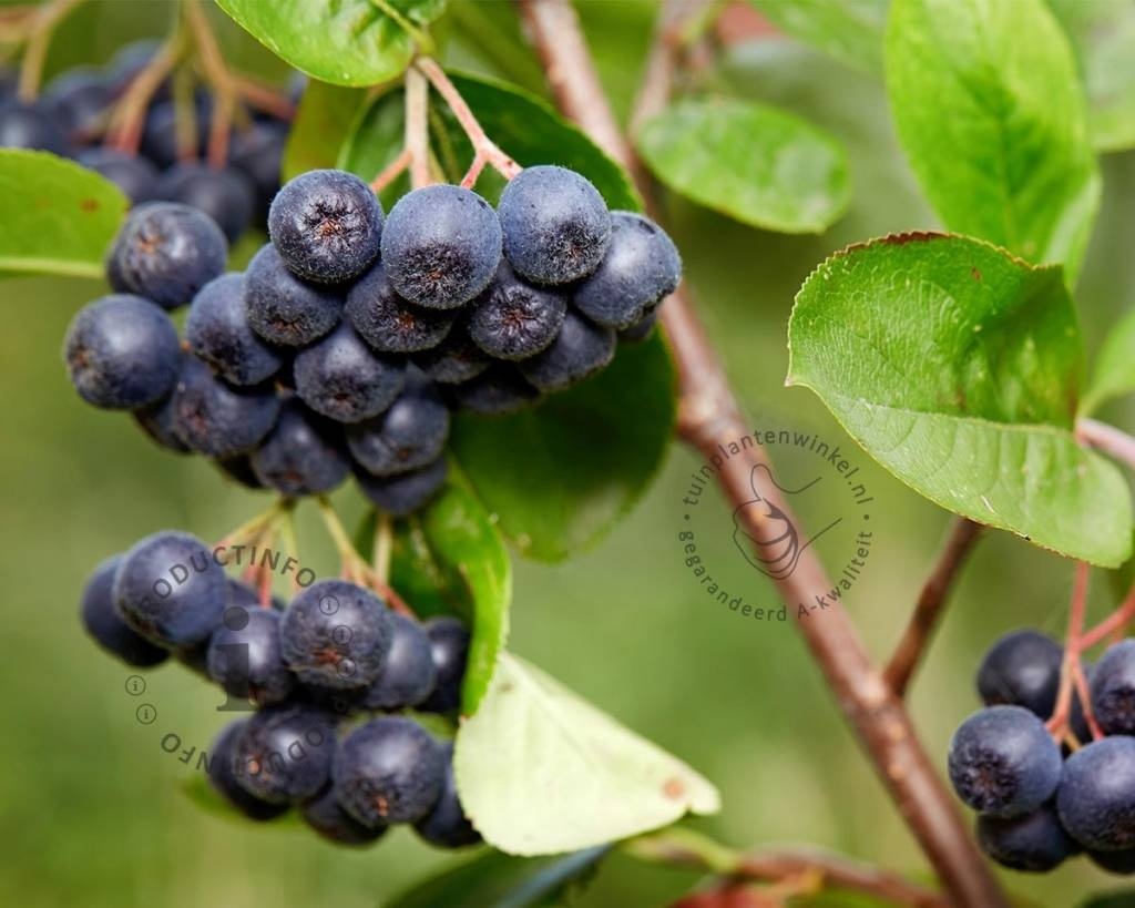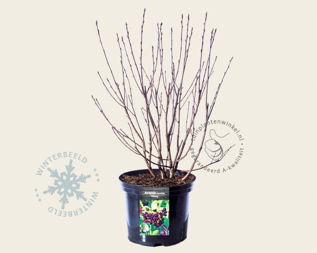 Aronia prunifolia 'Viking' - XL is een mooie tuinplant, die in april-mei bloeit met witte schermbloemen. Appelbes produceert veel paarszwarte bessen met antioxidanten, die geschikt zijn als superfood voor de verwerking tot sap of confituur. Aronia prunifolia 'Viking' - XL blijft een compacte struik, heeft weinig last van ziektes en is winterhard. In het najaar krijgt de tuinplant een felrode herfstkleur.
