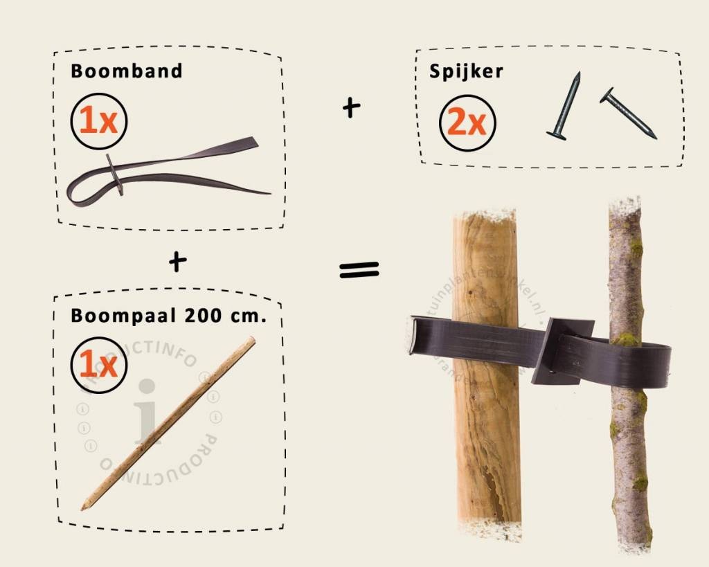 Gebruik de boomband niet om de boom nog recht te trekken. De boom moet uit zichzelf al recht staan. Bevestig de boomband aan de boompaal d.m.v. een paar spijkers of schroeven. (U krijgt twee spijkers meegeleverd van ons)