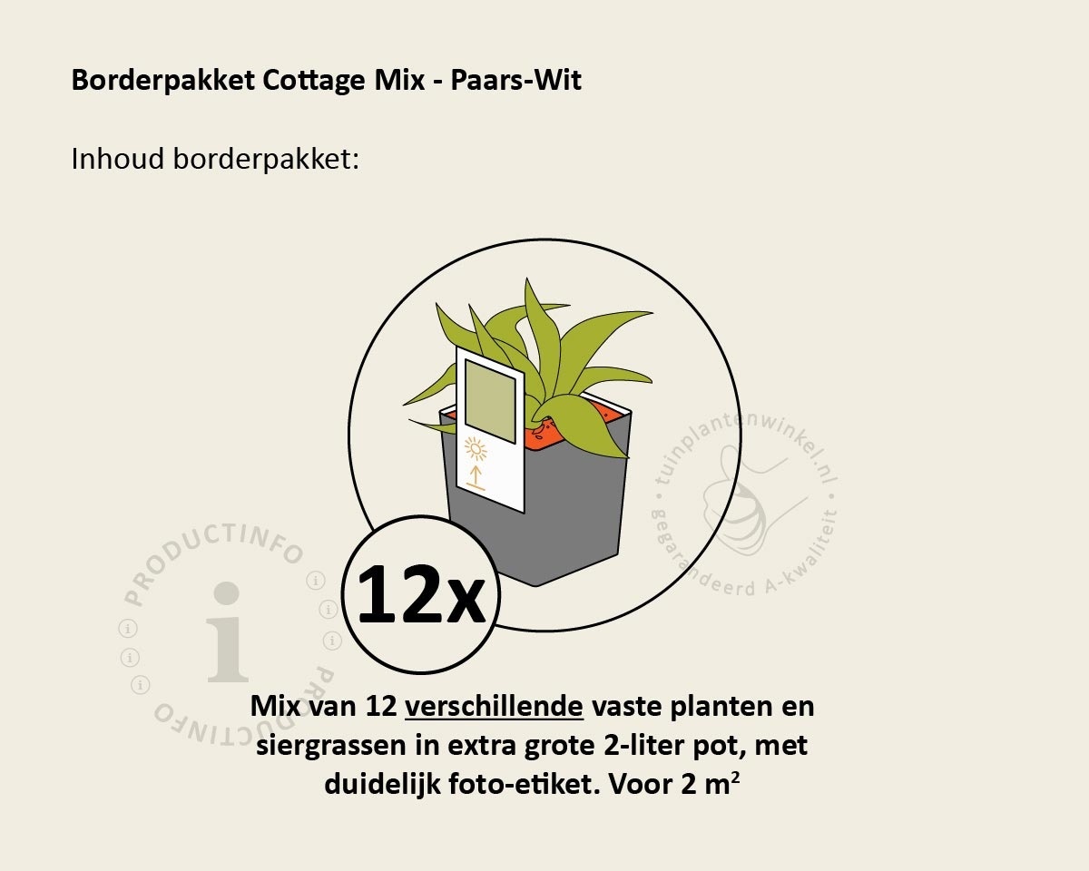 Het borderpakket Cottage - Paars-Roze-Wit bestaat enkel uit paars, blauw, roze en wit bloeiende planten in combinatie met siergrassen die hierbij goed aansluiten. Met dit borderpakket geniet u het hele voorjaar, zomer en najaar van een kleurrijk geheel.