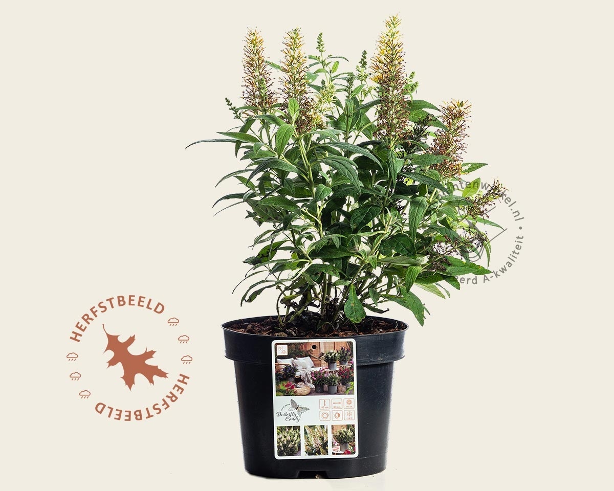 Deze wit bloeiende vlinderstruik zorgt in de zomer voor veel kleur bij u in de tuin. De bloempluimen bestaan uit ontelbare witte bloemen die allemaal rijk zijn aan nectar. Hierop vliegen de vlinders u op een mooie zomerdag letterlijk tegemoet. Ook andere nectarliefhebbers doen zich tegoed aan deze heerlijke lekkernij. Buddleja Butterfly Candy zijn compact groeiende vlinderstruiken met een bescheiden hoogte. Hierdoor zijn de struiken ook toepasbaar in de kleinere border of tuin. De bloei duurt van juli tot in september.