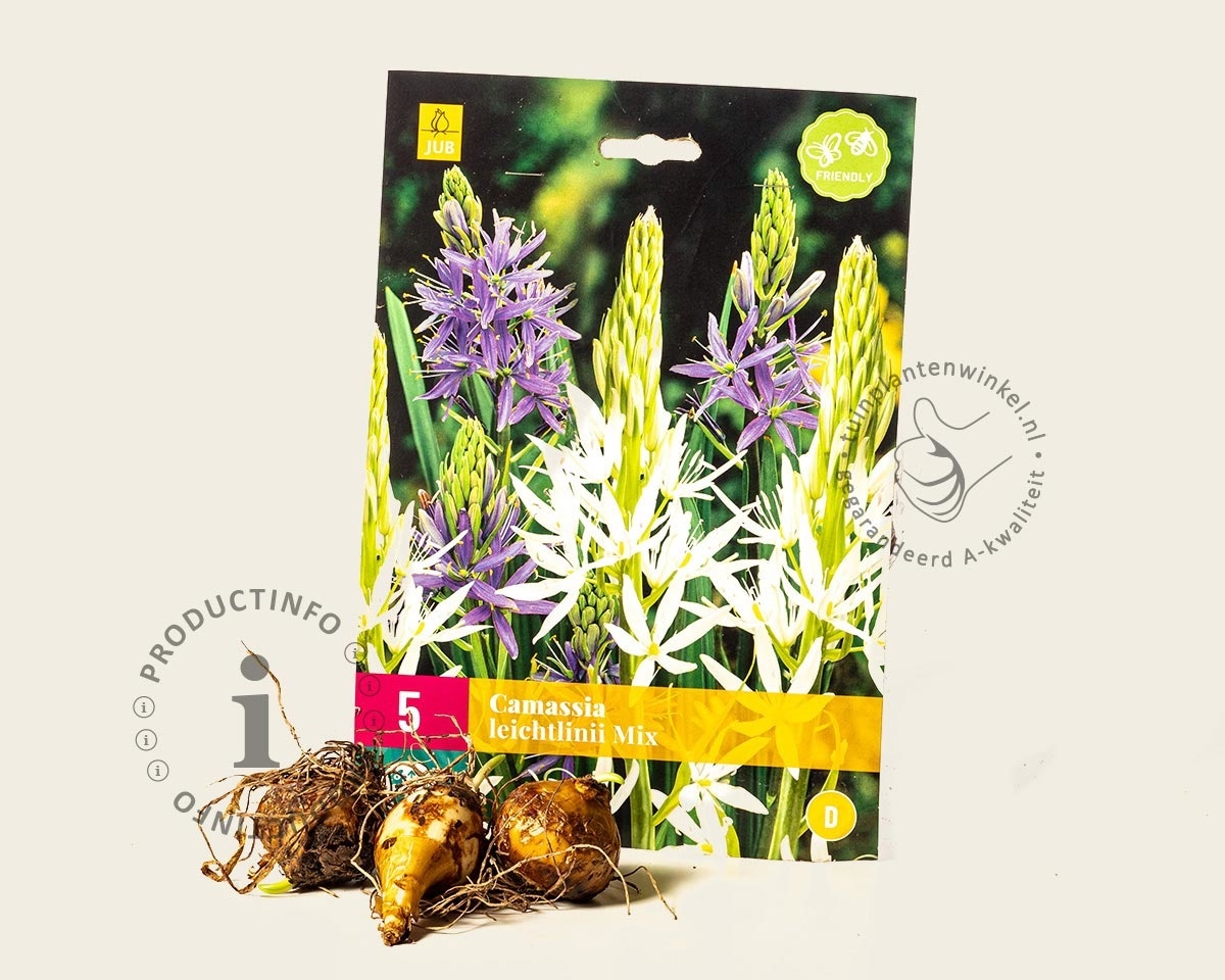 In deze bloembollenmix vindt u blauwe en wit bloeiende Camassia Leichtlinii. De Camassia is een tot de verbeelding sprekend bolgewas met speervormige bloemstelen in het voorjaar. Aan de stelen verschijnen tientallen blauwe of witgekleurde bloemen die van onder naar boven in bloei komen.