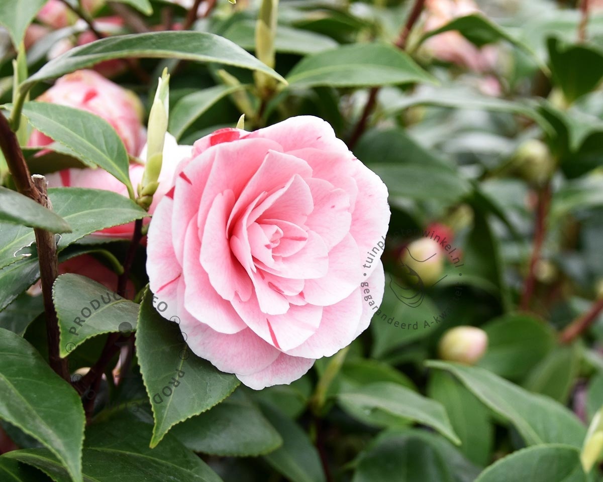 Camellia japonica 'Bonomiana' is een groenblijvende soort, met in het vroege voorjaar prachtige, grote, volle, lichtroze bloemen en eivormige, glanzende bladeren.