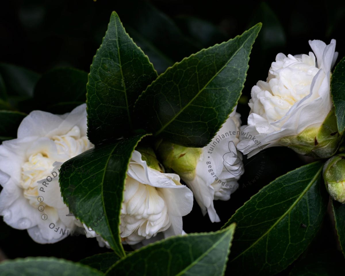 Van maart - mei bloeit Camellia japonica 'Powder Puff' met grote, witte bloemen, die wel iets op een roos lijken en mooi afsteken tegen het donkergroene blad. De tuinplant is wintergroen en vorstbestendig, alleen de jonge knoppen zijn in het voorjaar gevoelig voor nachtvorst.