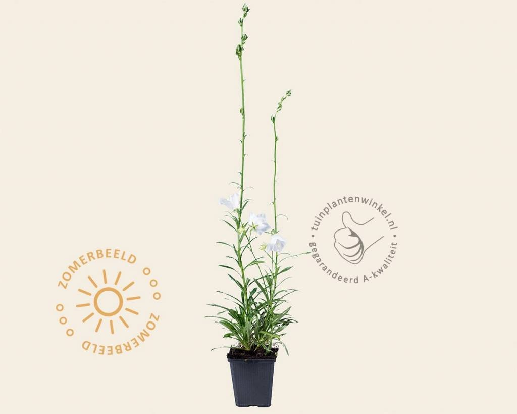 Campanula persicifolia 'Alba' heeft prachtige witte bloemetjes op stevige stengels. Het Perzikbladklokje trekt bijen en vlinders aan en combineert mooi met andere vaste planten: bv. met Geranium en Lavendel. Zet er een paar in een groepje bij elkaar; reken dan op 5 planten per vierkante meter. Met zijn worteluitlopers breidt de Campanula Alba zich uit. Ook het zaad van de bloemen zorgt voor nieuwe planten. Campanula persicifolia 'Alba' is goed winterhard, redelijk tot goed zeewindtolerant en verdraagt luchtverontreiniging.