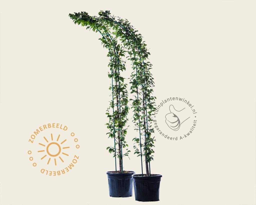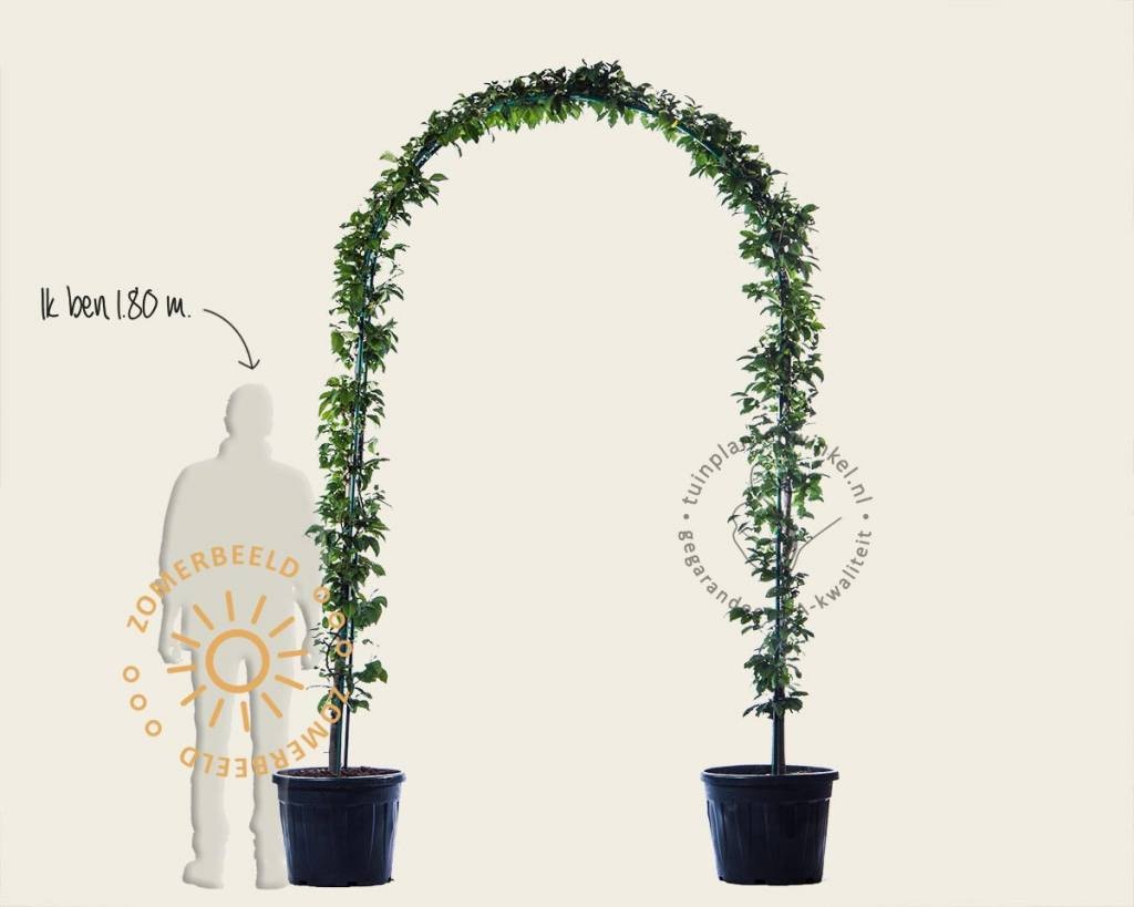 De boogvorm van Tuinplantenwinkel.nl heeft een doorloophoogte van 235 centimeter. De boog bestaat uit twee delen. Hierdoor is deze makkelijk te plaatsen. In een rij geplaatst over een pad ontstaat een soort tunnel. De maximale breedte van een verhard pad bij een standaard boog zonder tussenstuk is ongeveer 100 centimeter. Dit heeft te maken met de kluit van de bomen. De kluit heeft ruimte nodig, waardoor de stam van de boom een stukje van het pad af komt te staan. Als u een breder pad heeft en toch een boog wilt plaatsen, is het mogelijk om de halve bogen verder uit elkaar te zetten. De rekken kunt u vervolgens koppelen met bamboestokken, die u als extra optie kunt bestellen bij dit product. In de afbeeldingen wordt dit schematisch weergegeven. Als u de halve bogen uit elkaar plaatst en heeft gekoppeld met de bamboestokken, kunt u hieraan de takken die ontstaan tijdens de groei verder aanbinden. De twee halve bogen zullen snel naar elkaar toe groeien en één geheel vormen.