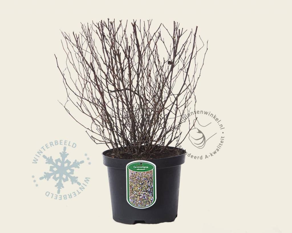 Dek de voet van Ceratostigma willmottianum in de winter af met bladeren of stro als bescherming tegen strenge vorst. Alle bladeren vallen in de winter af. Snoei de tuinplant pas na de winter terug tot ongeveer 20 cm boven de grond.