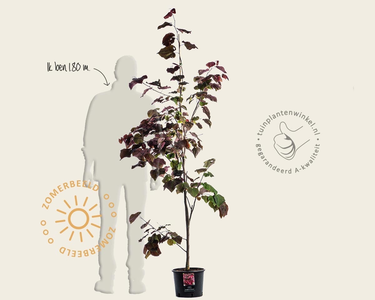 Cercis canadensis Forest Pansy krijgt in mei-juni roze bloemen, die mooi afsteken tegen het nog naakte, donkere hout. Daarna verschijnen de roodgroen gekleurde bladeren. De Judasboom heeft al meteen van onder zijtakken(beveerd), maar heeft toch een vrij open vorm, zodat het zonlicht gefilterd wordt doorgelaten. De Cercis canadensis Forest Pansy voldoet als solitair in de border of op het gazon en als laanbeplanting.