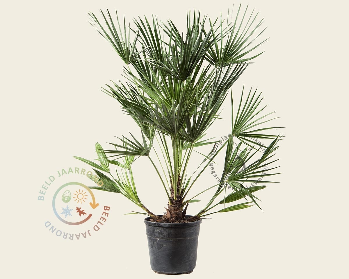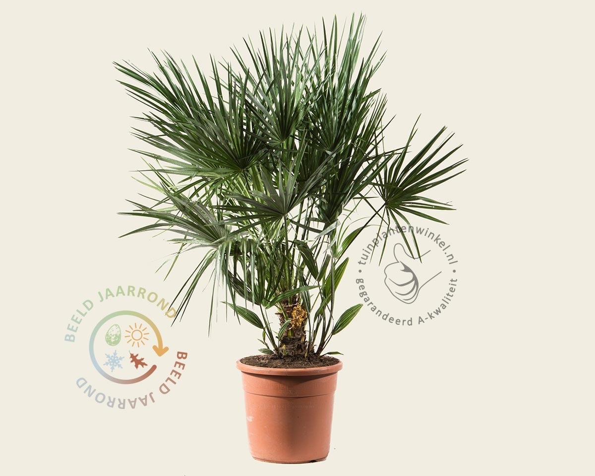 Staat de Palmboom in een kuip op uw balkon of dakterras, dan wel regelmatig water geven. Chamaerops humilis is redelijk winterhard tot -8°C/-9°C. Bij strengere vorst de tuinplant beschermen met speciaal vliesdoek of een dakje boven de bladeren van bv. een oude paraplu, zodat er geen sneeuw of vocht in de groeipunten kan komen. Als de Palmboom in een pot staat kunt u deze tijdelijk vorstvrij zetten of onder een overkapping (hier vriest het een stuk minder). Oude bladeren kunnen worden verwijderd, maar snoei nooit in de stam. Doe wel handschoenen aan!