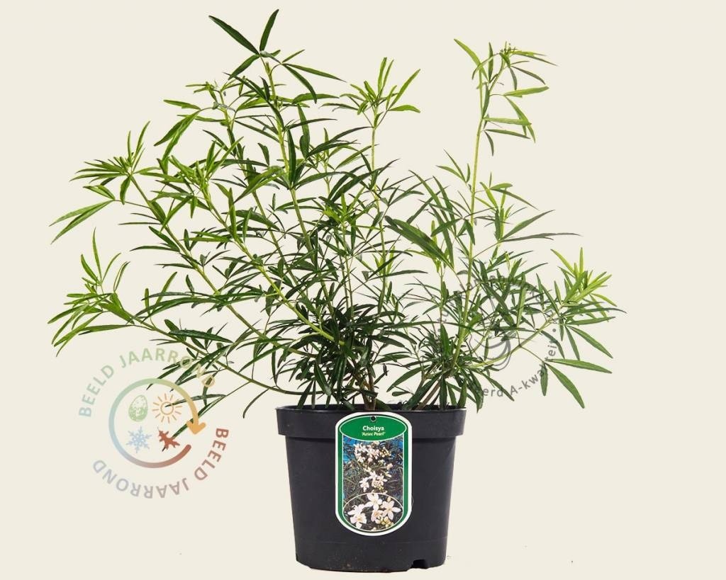 Choisya ternata 'Aztec Pearl' komt oorspronkelijk voor in het zuiden van de VS en in Mexico. De tuinplant bloeit tweemaal, in het voorjaar en in de late zomer, met heerlijk geurende, stervormige, zuiver witte bloemetjes. De aromatische blaadjes zijn smal, en zorgen in de winter voor een groen accent. Het is een decoratieve plant voor elke tuin: de exotische tuin, de Japanse tuin; en ook prima geschikt als kuipplant op een terras/balkon.