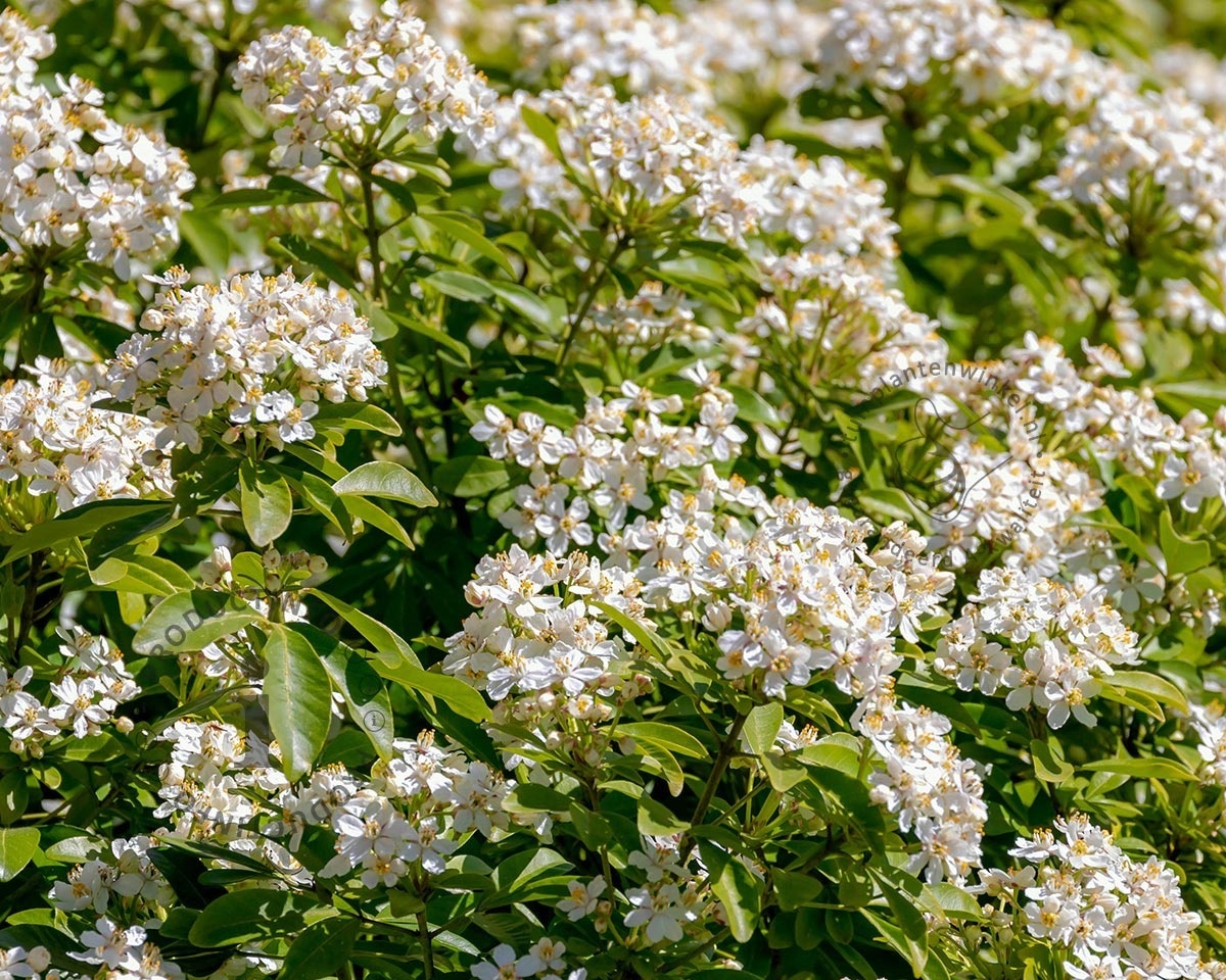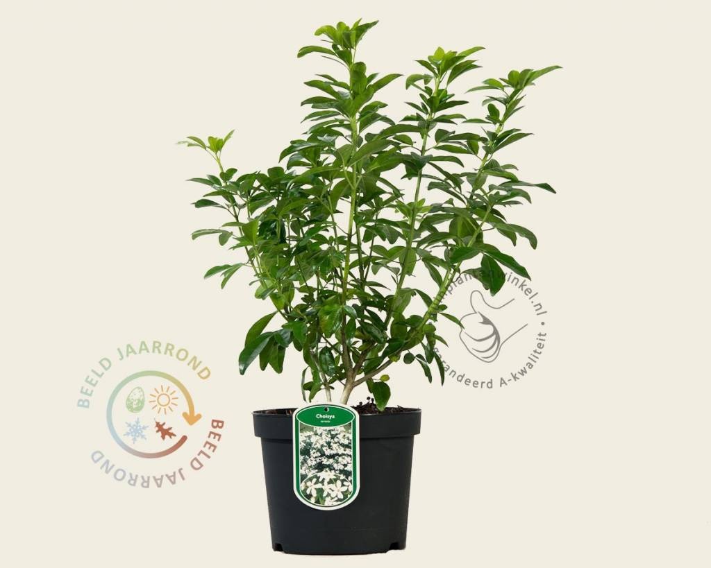 Choisya ternata is een groenblijvende heester, bloeit soms al in februari en in mei-juni met trosjes witte, heerlijk honingzoet geurende bloemen, die mooi afsteken tegen het smalle glanzend groene, decoratieve blad. In de herfst is er soms een tweede bloeimoment. Oorspronkelijk komt de tuinplant uit Mexico, is verwant aan het sinaasappel- en citroenboompje en is erg geschikt voor een patio.