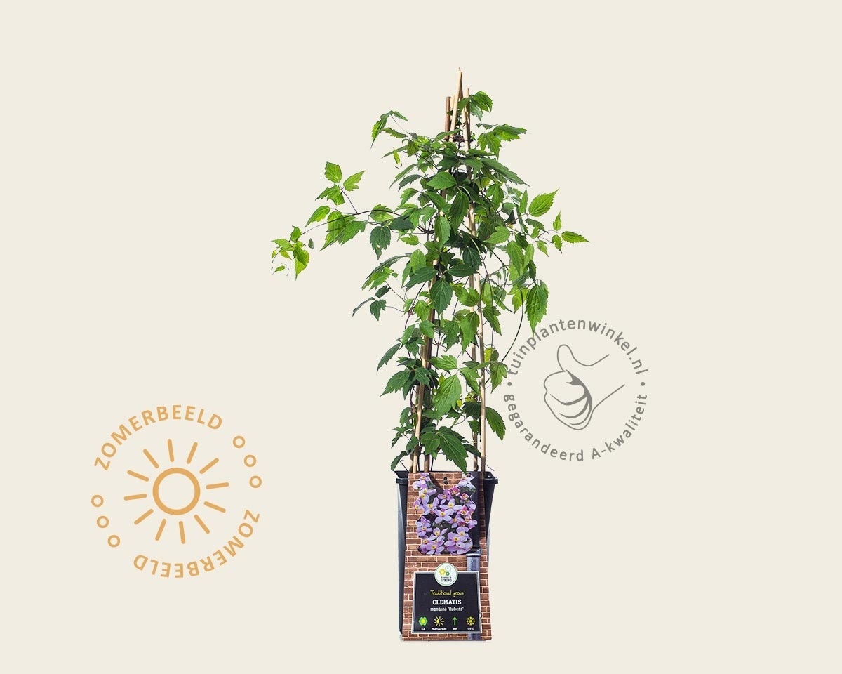 Deze kleinbloemige, rijkbloeiende Bosrank krijgt in het voorjaar een weelderige overvloed aan geurende, zachtroze bloemen, die een sprookjesachtige sfeer oproepen. Alle montana soorten, dus ook de Clematis montana 'Rubens', zijn sterke groeiers en krijgen veel bloemen. Ze maken veel meer ranken en ook langere ranken dan de meeste grootbloemige Bosranken. De tuinplant is perfect voor het begroeien van pergola's; ook langs muren of schuttingen kan hij prima staan. Hij heeft dan wel hulp nodig om te kunnen klimmen. De Clematis montana 'Rubens' hecht zich namelijk niet vast, maar heeft ranken, die zich om bijvoorbeeld een draad of gaaswerk draaien. Mooie en opvallende eigenschap van de Bosrank is het naar purperrood verkleurende blad. De klimplant is niet wintergroen.