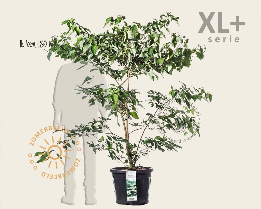 Cornus controversa - XL+ is een hoge heester die wel 4 tot 5 meter wordt. Opvallend is de etage-gewijze groei van de takken. In juni-juli komen er mooie, witte bloemen in een soort trosjes aan deze tuinplant . Soms verschijnen er na de bloei donkerblauwe bessen aan de Kornoelje. In de herfst verkleuren de tamelijk grote bladeren dieprood; mooi om te zien! De Cornus controversa is geschikt als solitaire tuinplant.