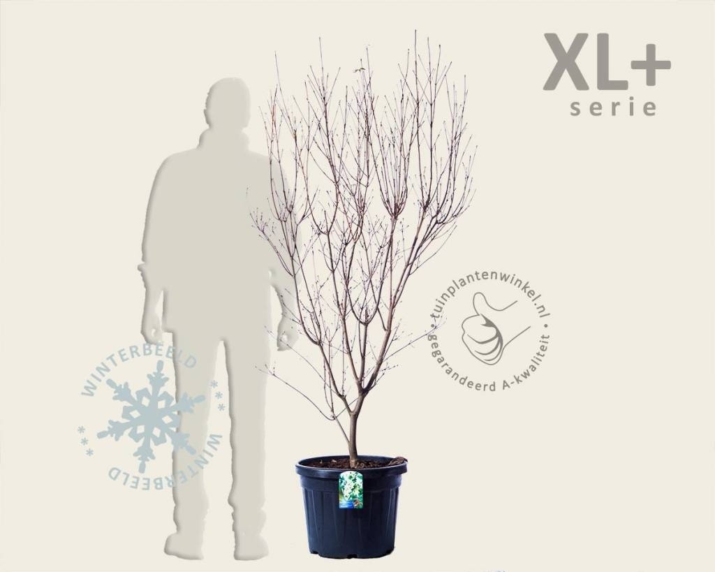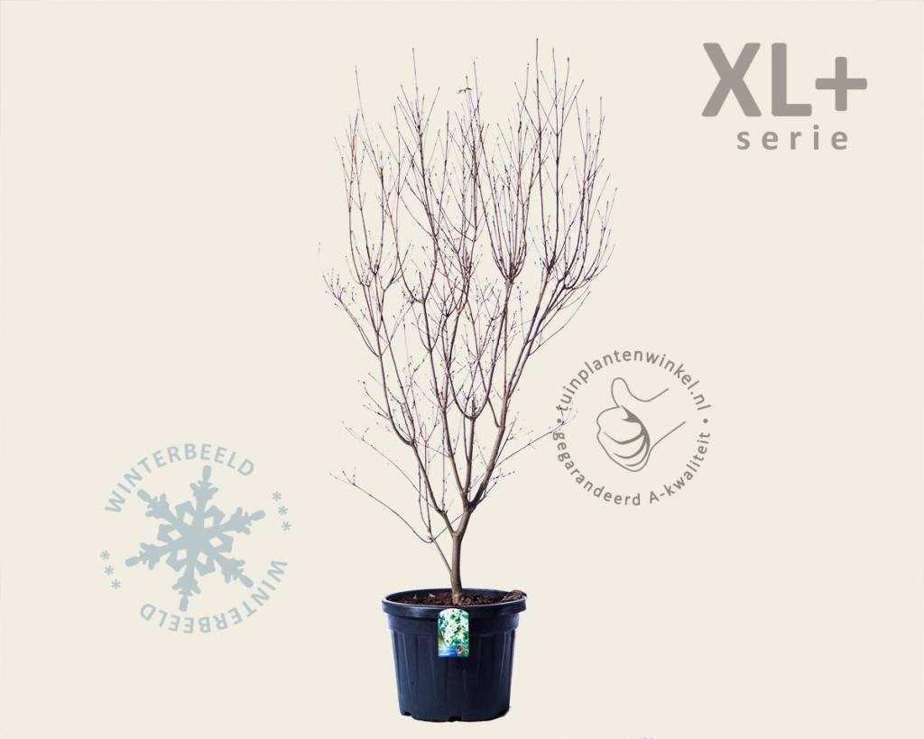 Cornus kousa 'China Girl' biedt in elke seizoen iets anders. Het meest in het oog springend zijn de bloemen die aan de tuinplant verschijnen aan het einde van het voorjaar. De schutbladeren van de bloemen kleuren roomwit en staan met zijn vieren rondom een klein rond groen knopje. Het levert een fraai beeld op dat ruim een maand aan houdt. Na de bloei van de Japanse kornoelje vallen de schutbladeren af en beginnen de knopjes op te zwellen. Een aantal van hen groeit uit tot een roodgekleurde vrucht waar de vogels zot op zijn. In het najaar begint het blad vaak te verkleuren naar rode tinten en daarmee eist de tuinplant wederom alle aandacht op in uw tuin. Ook het vernoemen waard is de karakteristieke groeivorm: de takken waaieren naar boven toe uit. In de winter is het silhouet goed herkenbaar en ook als de plant bloeit levert dat een fraai beeld op. De Japanse kornoelje is dus een veelzijdige plant. Hij komt het beste tot zijn recht als solitair. Met deze extra grote uitvoering heeft u direct resultaat. Voordeel van de 'China Girl' is dat deze kornoelje vrij snel bloemen geeft.