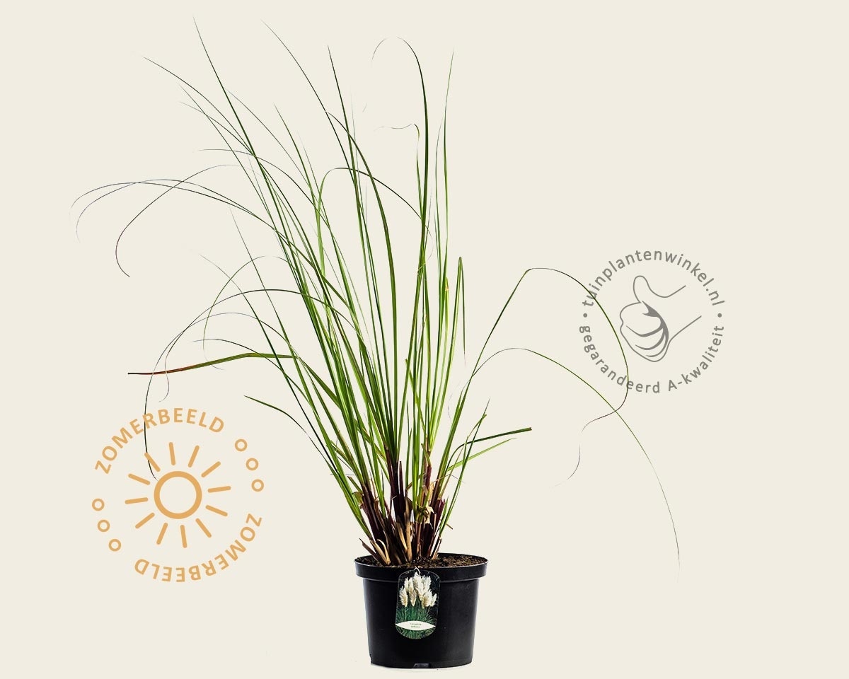 Cortaderia selloana (Pampasgras) is een zeer attractieve solitair, die oorspronkelijk uit Zuid-Amerika komt. Pampasgras bloeit van september - oktober met volle, zilverwitte pluimen die de grootste van alle grassen zijn en tot twee en een halve meter hoog kunnen worden; zij blijven een eyecatcher tot november; teveel regen zorgt wel voor bruine verkleuring. Pampasgras groeit ook in de breedte flink door, geef hem dus de ruimte. De lange smalle bladeren van Pampasgras verkleuren en verdorren in de winter. Laat ze gewoon zitten als natuurlijke beschermer tegen koude en uitdrogende winden.