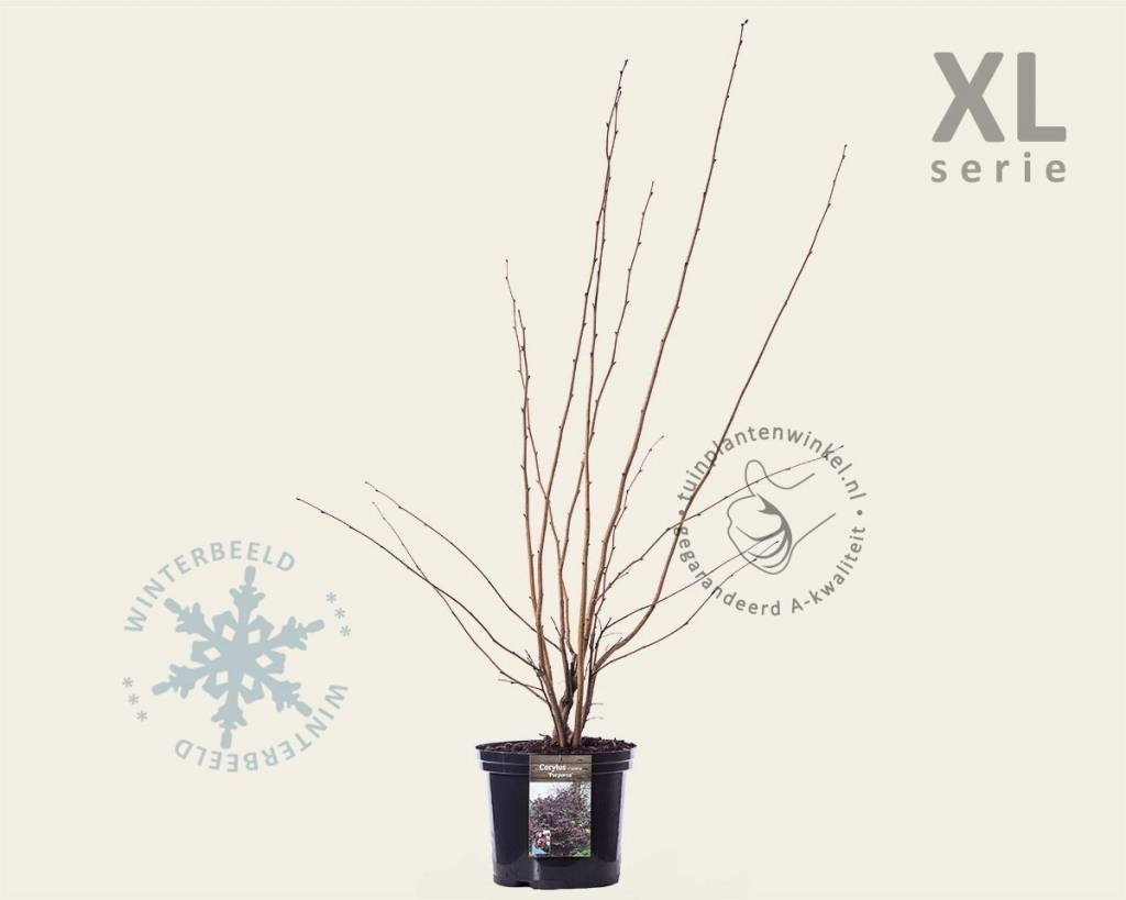 Corylus maxima 'Purpurea' - XL is een mooie heester, die prachtig als solitair in de tuin staat en die ook in openbaar groen aangeplant wordt. De tuinplant heeft grote, decoratieve, purperrode bladeren, die in de zomer meer donkergroen kleuren. Tijdens de vroege bloei verschijnen er roodbruine katjes (mannelijk) en groengele bloemen aan de Rode hazelaar. De latere noten zijn eetbaar.