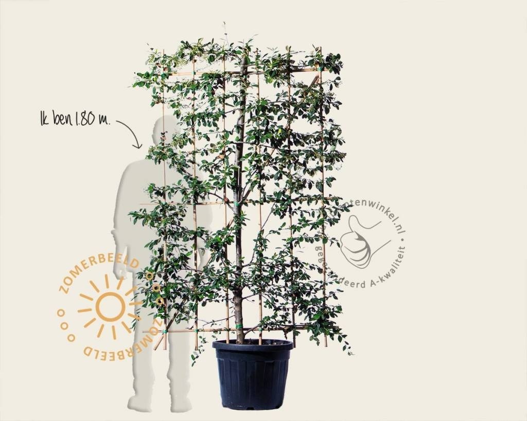 Normaliter groeit de struik tot een flinke breedte en hoogte, mede door de overhangende twijgen, maar in deze versie zijn de takken aangebonden in een rek. Daardoor blijft de struik smal en kan hij prima dienen als haag of bijvoorbeeld ter camouflage van een muur of schutting.