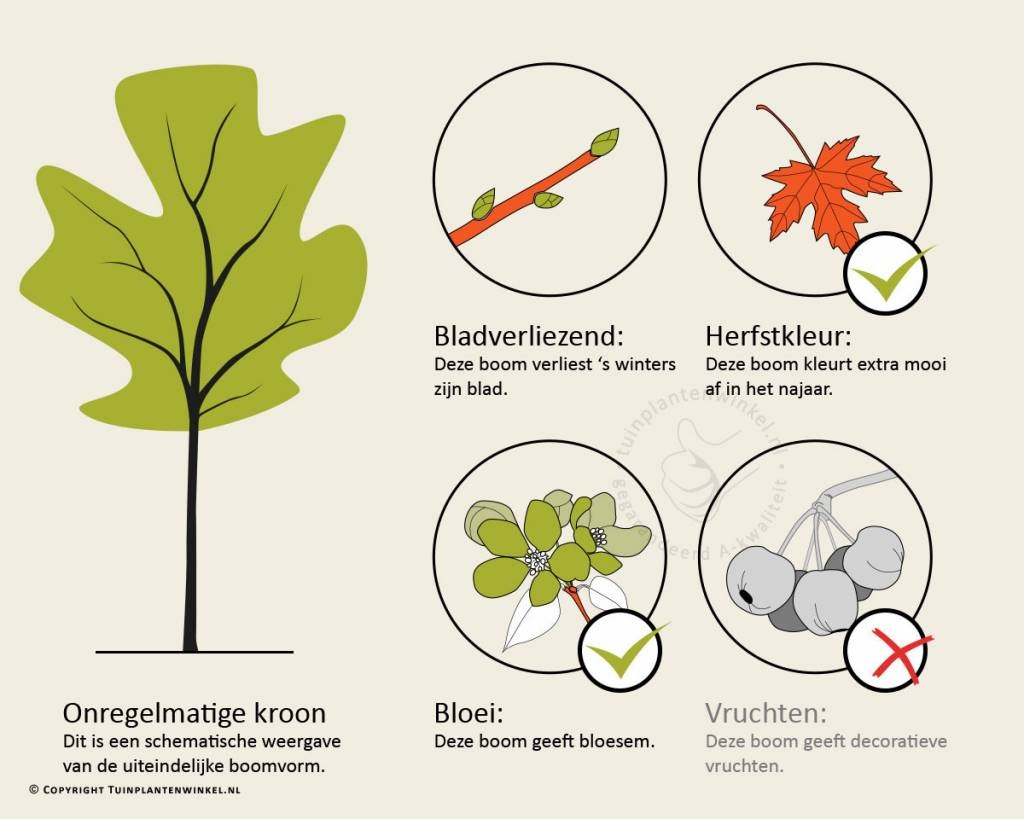 Bomen van tuinplantenwinkel.nl kunt u jaarrond planten. Dit kan omdat we al onze bomen in pot leveren. Aanplanten in de herfst, winter, lente én zomer is dus altijd mogelijk, met aangroeigarantie!