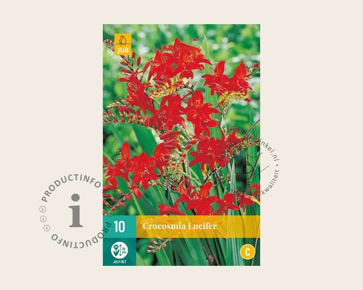 De Crocosmia 'Lucifer' is een vaste plant (knol) met in de zomer een hele mooie bloeiwijze met hun gebogen aren. Ze komen prachtig uit tussen siergrassen. Crocosmia 'Lucifer' staat het liefst in de zon of halfschaduw in een humusrijke zanderige, losse bodem. De variant 'Lucifer' is goed winterhard, maar kan niet goed tegen te natte grond, maar u kunt de knollen in de winter wel in de grond laten zitten. Dek de tuinplant bij strenge vorst af met een oude deken of een bladerdek. De bloemen zijn prima geschikt als snijbloem.