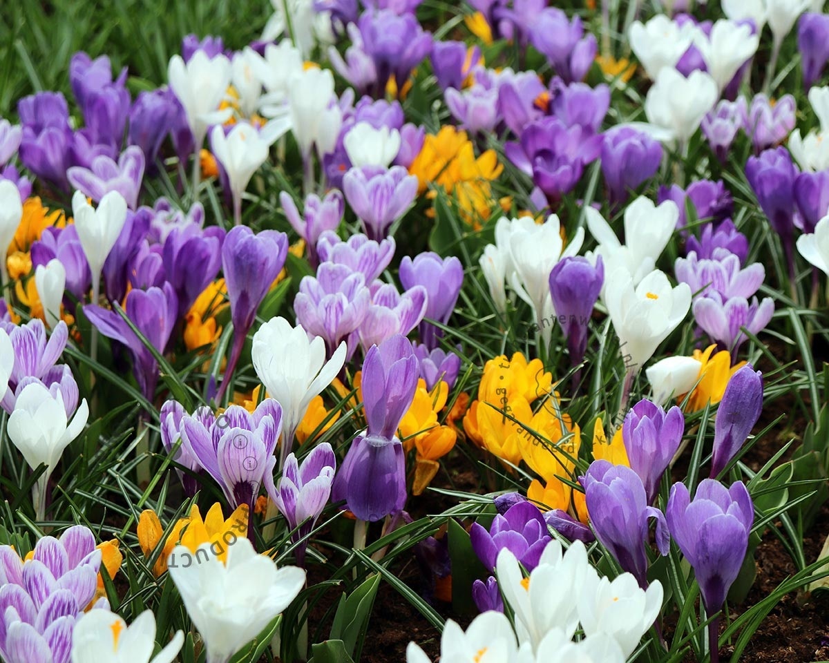 Samen met het Sneeuwklokje is de Crocus het bekendste vroegbloeiende bolgewas. Als bijna alle heesters en vaste planten nog in winterrust zijn, geeft de Crocus het bloemenperk alweer kleur; in dit geval een mix van gele, paarse en witte bloemen. Het blad van de Krokus kenmerkt zich door de smal langwerpige, bijna op gras lijkende vorm.
