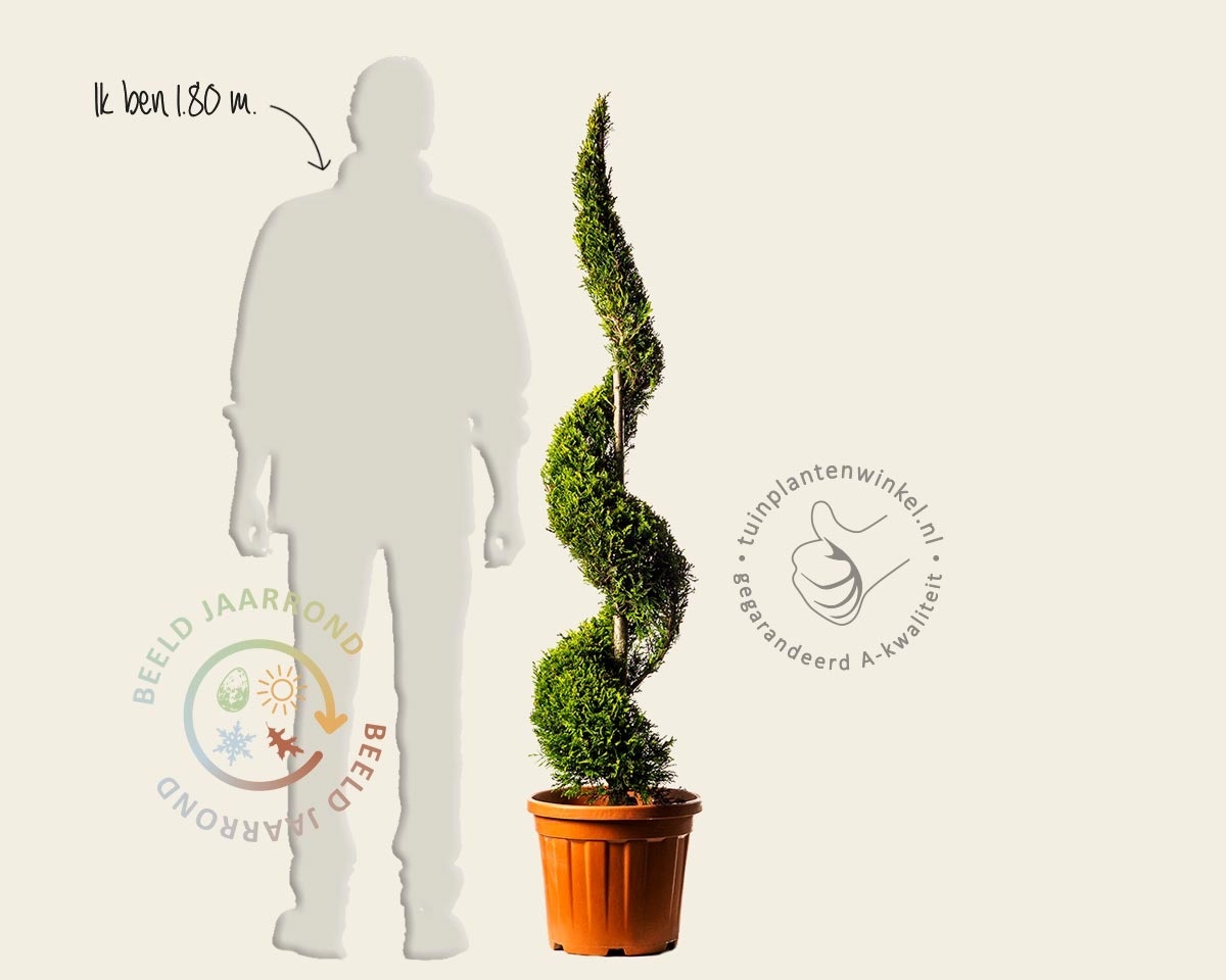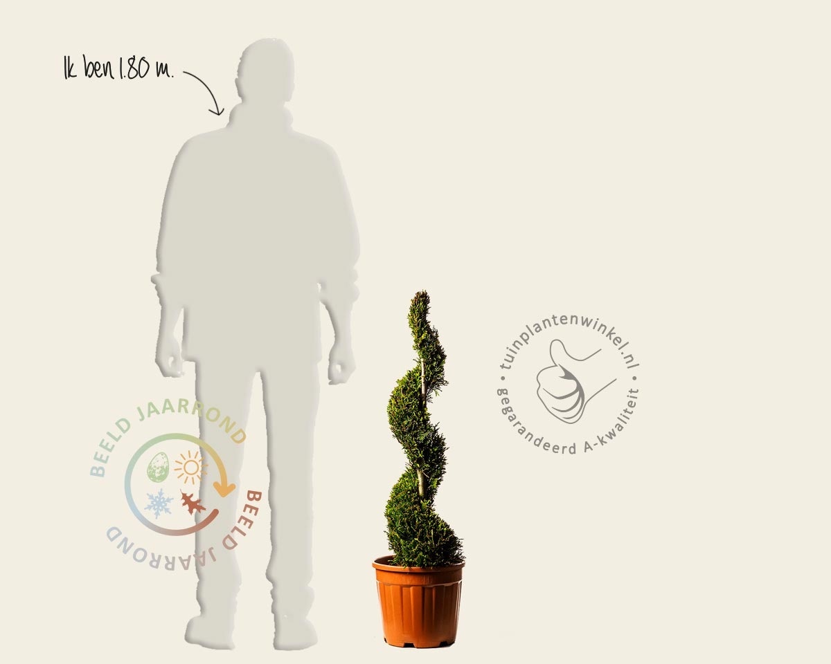 Deze spiraalvorm van de leylandcipres kan zowel in de tuin als in een pot worden aangeplant. Door jaarlijks te snoeien blijft de vorm en hoogte behouden. De 'Castlewellan Gold' loopt fris groen/geel uit wat deze plant een frisse uitstraling geeft.