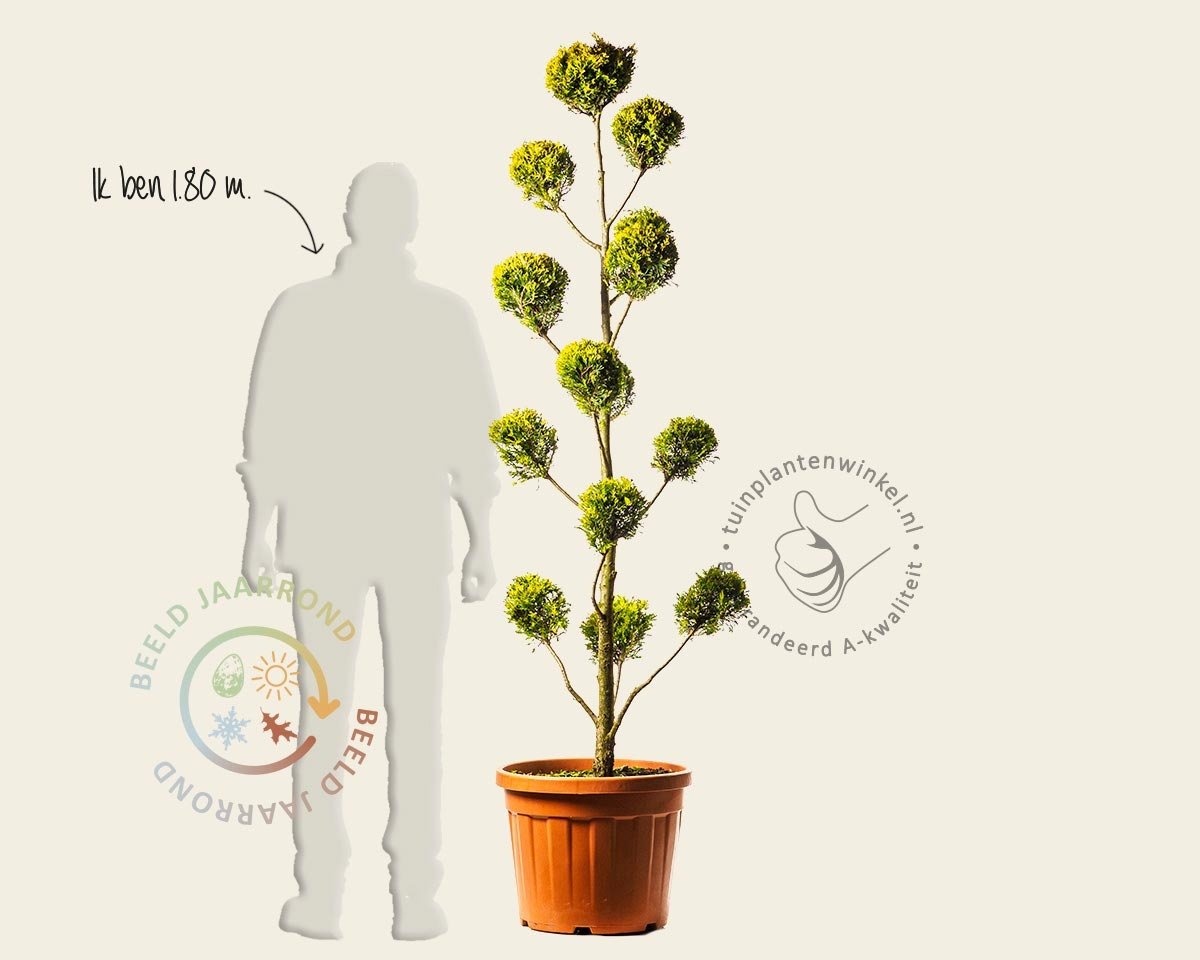 Deze conifeer is een vormgesnoeide uitvoering van de Cupressocyparis leylandii 'Gold Rider'. Dat is een hele mond vol. De tuinplant is beter bekend als de Leylandcipres. Het is een gemakkelijk en goed te snoeien conifeer. Dit type heeft mooie frisgroen/gele schubben. Daardoor is het een opvallende verschijning in de tuin die mooi tot zijn recht komt voor een donkergroene achtergrond van bijvoorbeeld Taxus of een hedera haag. In pompon gesnoeid betekent dat de plant bestaat uit meerdere kleine bolvormen die rondom een centrale hoofdstam gerangschikt staan.