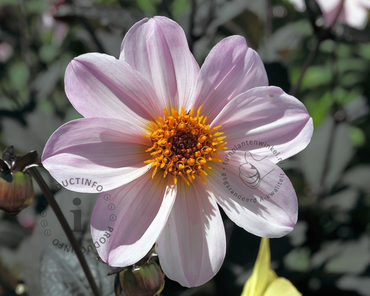 De Dahlia 'Bishop of Leicester' heeft donker bladeren waar de bloemen van deze Dahlia zich mooi tegen aftekenen. De bloemen zijn halfgevuld en lichtroze van kleur. De gele meeldraden lijken zo uit de bloem te springen.