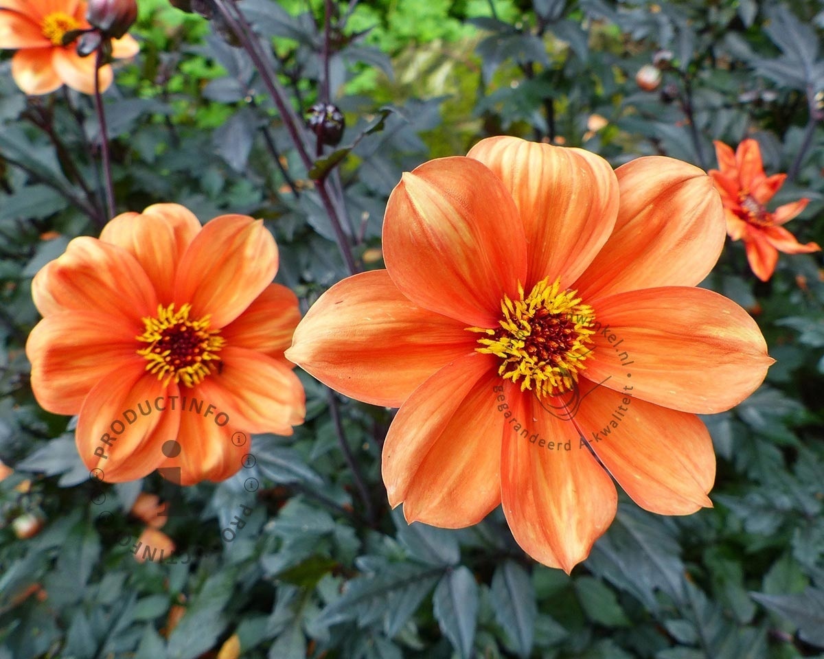 Deze donkerbladige Dahlia wordt ongeveer 90 cm hoog. Deze Dahlia past perfect in de tuin tussen andere vaste planten en heesters in de zon. De halfgevulde oranje bloemen waarvan de meeldraden zichtbaar zijn, trekken veel bijen aan.