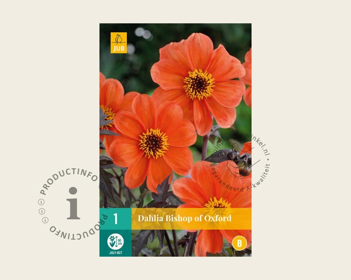 Dahlia 'Bishop of Oxford' is een ware eye-catcher voor in de tuin. De oranje halfgevulde bloemen steken mooi af tegen het donker gekleurde blad. Het is een soort dat uitbundig bloeit.