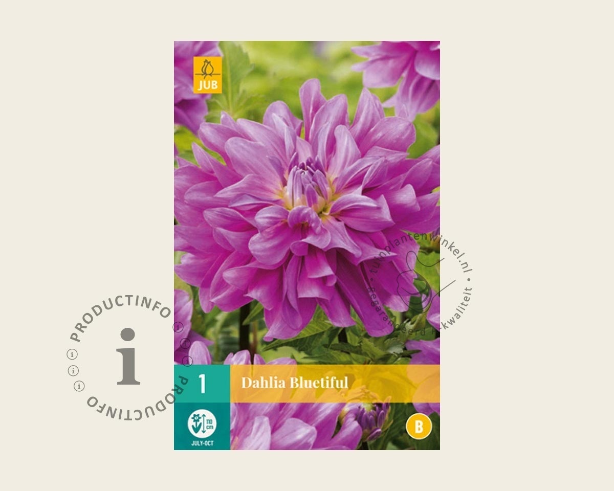 De Dahlia Bluetifull is een schitterende toevoeging aan elke tuin. Deze grootbloemige dahlia variant, bekend om zijn unieke en levendige blauwachtige tinten, is een echte blikvanger. De bloemen zijn opvallend groot en vormen een prachtig contrast met het donkergroene blad. Deze soort is niet alleen een lust voor het oog, maar ook bijzonder geliefd bij vlinders en bijen, waardoor het een ecologisch waardevolle keuze is voor uw tuin.