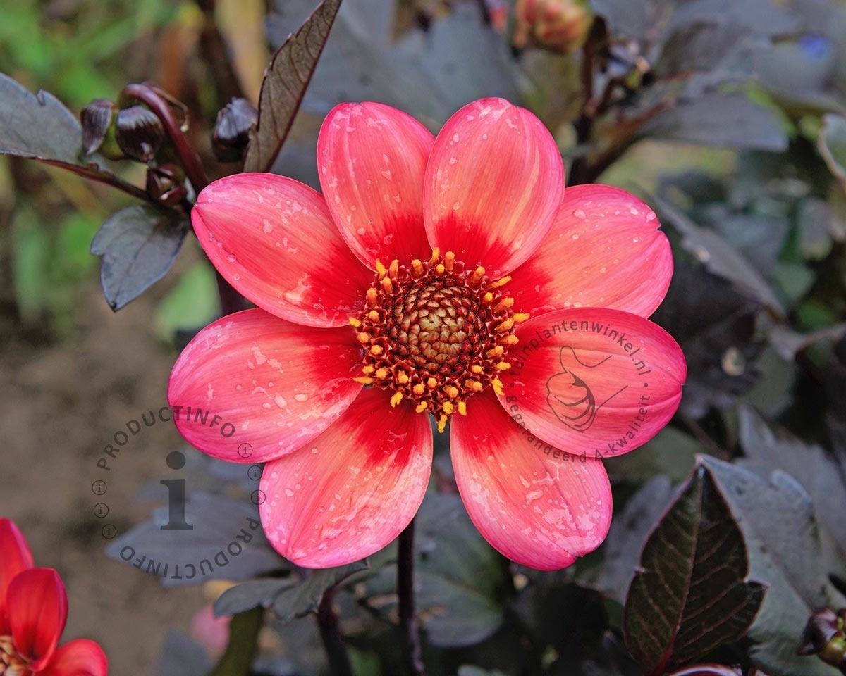 Als Dahlia 'Dahlegria Tricolore' bloeit, heeft deze acht zalmkleurige blaadjes die mooi afsteken tegen het purper roze donker blad. De naam zegt het al 'Tricolore' de bloem heeft veel verschillende tinten. De uitgebloeide bloemen mag u afknippen zodat de plant nieuwe scheuten gaat maken waar weer nieuwe bloemen op verschijnen.