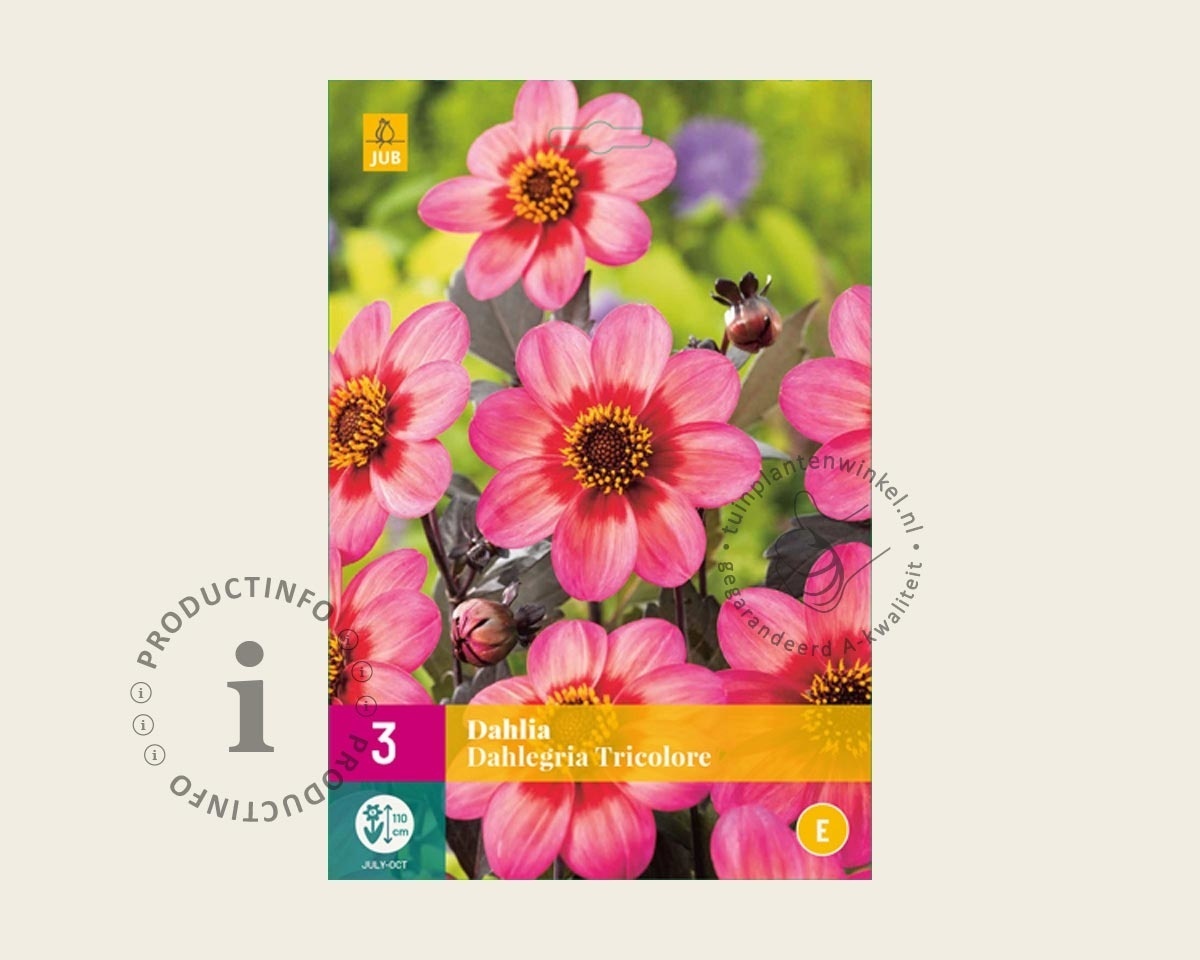 De bloei van de Dahlia 'Dahlegria Tricolore' is in de maanden juli tot oktober. Rond het geeloranje hart staan de zalmkleurige blaadjes in een kersenrood kransje. De talloze vrolijke bloemen geven een mooi contrast tegenover het donkere blad. De bloemen staan ook op donkergetinte stelen.
