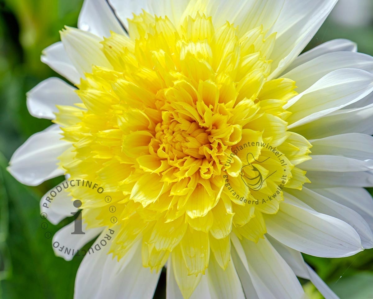 De bloemen van de Dahlia '(Freya's) Paso Doble vallen op door de kleur. De bloem is van binnen uit geel en de buitenste bloembladen kleuren bijna wit. Ook goed te gebruiken als snijbloem.