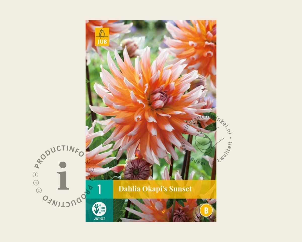De Dahlia 'Okapi's Sunset' floreert het best op een zonnige plaats in uw tuin, waar hij minimaal 6 uur direct zonlicht per dag kan ontvangen. Deze plant houdt van een goed doorlatende, vruchtbare grond. Voor het beste resultaat is het aan te raden om de grond te verrijken met compost of organische meststoffen om de groei en bloei te stimuleren.