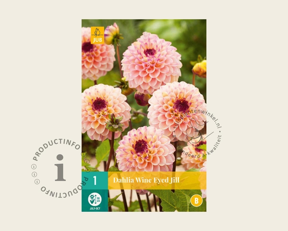 De Dahlia 'Wine Eyed Jill' is een opvallende verschijning in elke tuin. Met haar schitterende bloem die een unieke wijnrode kern heeft, omringd door zachte, roze bloemblaadjes, is deze variëteit een echte blikvanger. Deze middelgrote dahlia's bereiken een hoogte van ongeveer 90 tot 120 cm en bloeien van de vroege zomer tot de eerste vorst, waardoor Pompon dahlia's een langdurige en kleurrijke toevoeging zijn aan elke tuin of bloembed.