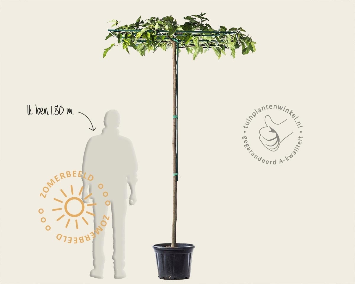 Speciaal voor deze functie is er een vruchtloze boom geselecteerd want de vallende vruchten zorgen voor flink wat overlast wanneer u onder de boom een mooie tafel wilt plaatsen. Deze selectie van de dakmoerbei heet met zijn Latijnse naam de Morus alba ‘Fruitless'. In mei ontwikkelt de boom grote, glanzende, donkergroene bladeren die al snel een gesloten dek vormen. ‘Fruitless' zegt al dat deze soort geen vruchten draagt, zodat uw tuinmeubels schoon blijven en er geen ook geen extra poetsbeurten voor het terras nodig zijn.