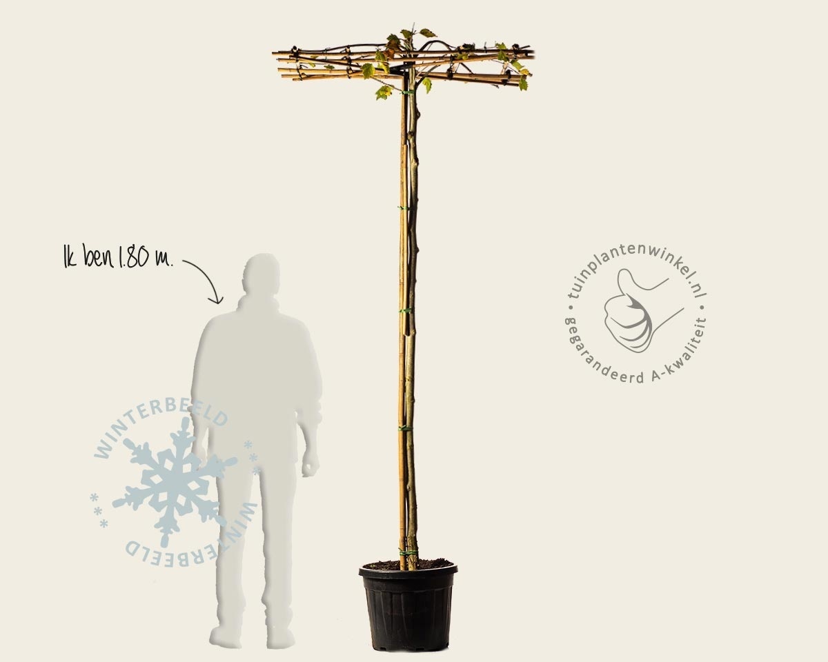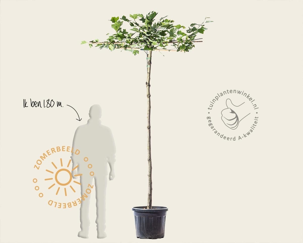 Antwoord: Dat is afhankelijk van de stam van de dakplataan met grote bladeren, bij tuinplantenwinkel.nl hanteren we standaard ongeveer 215 tot 230 cm stamhoogte (dit is de hoogte waar het dak begint) zodat u er gemakkelijk onderdoor kunt lopen. Natuurlijk moet u wel blijven snoeien om te voorkomen dat de boom zijn oorspronkelijke vorm weer aanneemt. We bieden Dakplataan aan in vierkant dak maar ook met een kruis model.