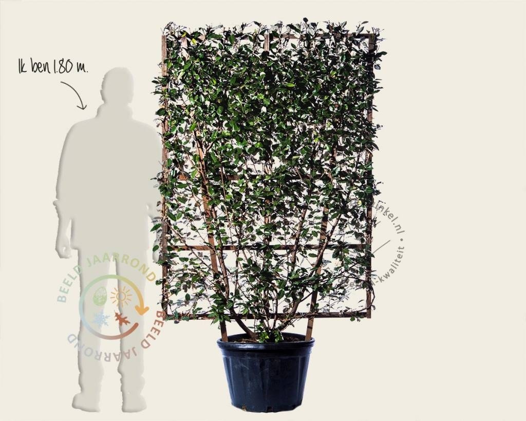 Elaeagnus ebbingei is een kant-en-klare haagoplossing. De struik is aangebonden in een rek van 110 x 160 centimeter (breedte x hoogte). Het volledige rek is gevuld en geeft snel resultaat. Deze tuinplant kan worden gebruikt voor een middelhoge haag, als ruimtelijk element in de tuin of ter camouflage van een muur.