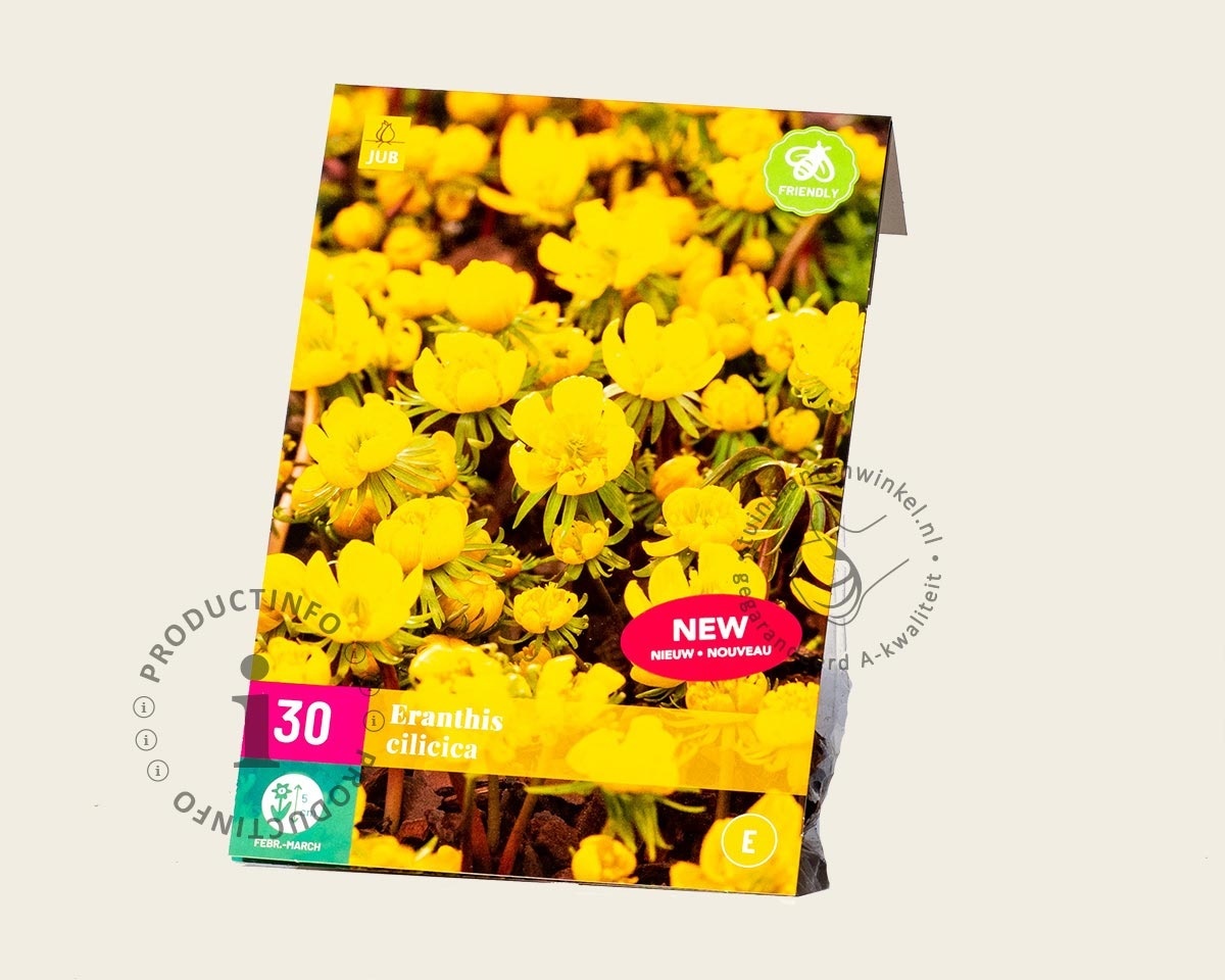De Eranthis cilicica is een van de vroegst bloeiende voorjaarsbollen. Al in februari kunnen de eerste knoppen zich openen. De bloemen van de Winterakoniet zijn geel en lijken wat op die van de boterbloem. Dit bolgewas zaait zichzelf uit tussen heesters en onder bomen. Goed te combineren met bijvoorbeeld Galanthus nivalis (Sneeuwklokjes). Na ontvangst de bolletjes zo snel mogelijk planten om uitdroging te voorkomen.