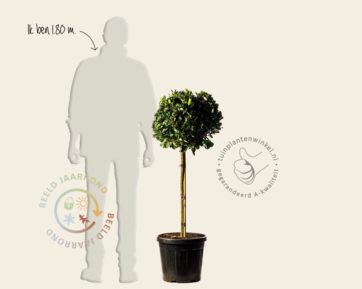 De groenblijvende Kardinaalsmuts is in deze uitvoering gesnoeid tot een bolvorm op stam. Dit kleine boompje is ideaal voor een kleinere tuin of bijvoorbeeld in de voortuin. Euonymus japonicus heeft donkergroen blad. Het boompje blijft jaarrond groen. Het oude blad wordt door het jaar heen afgestoten om plaats te maken voor nieuwe verse bladgroei.