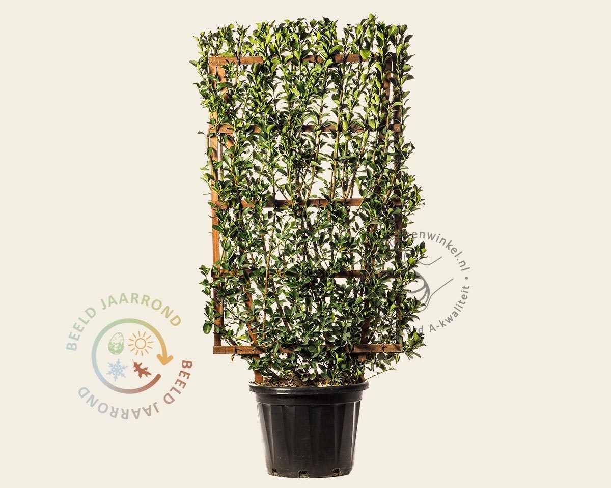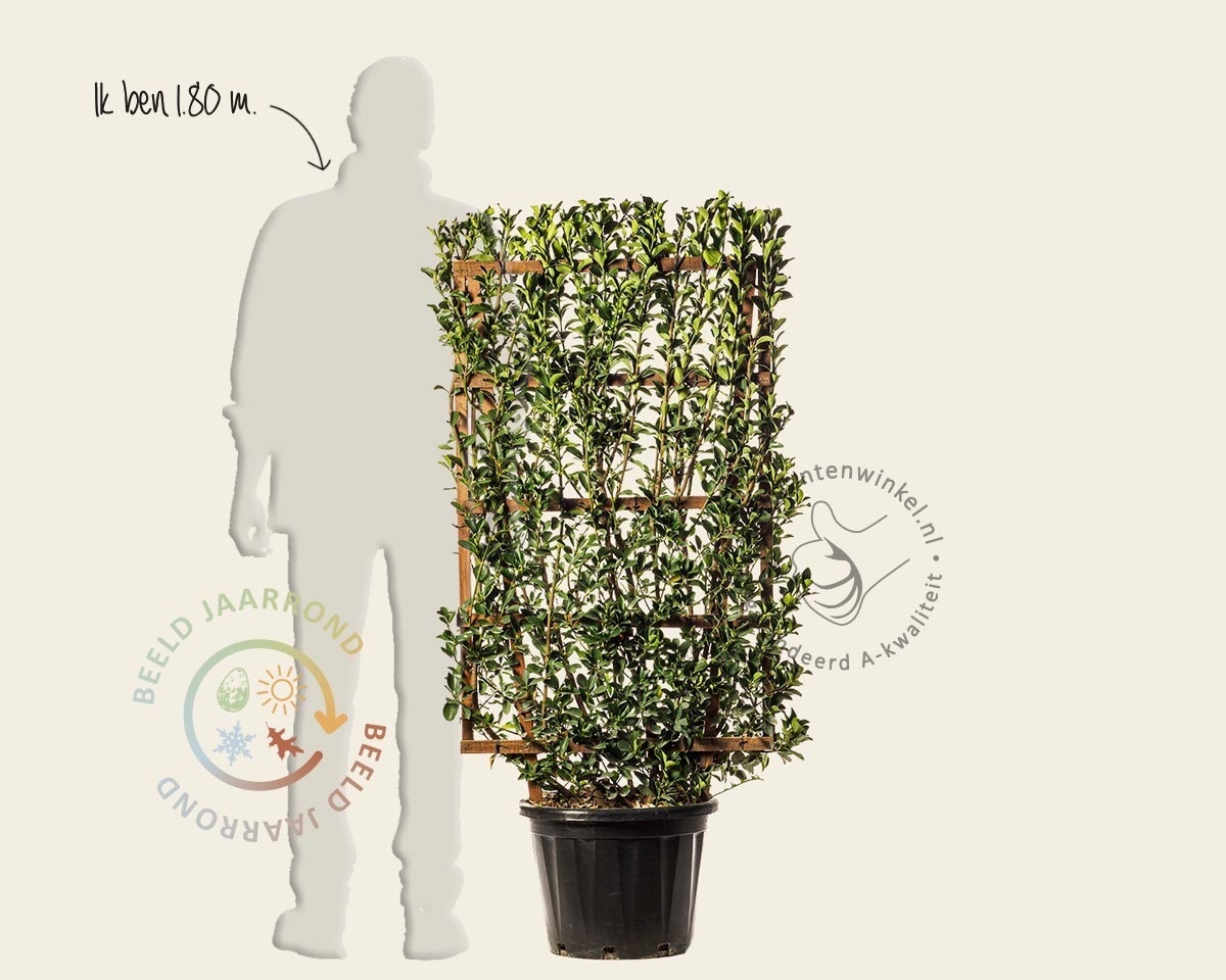 De tuinplant is aangebonden in een stevig houten frame. De hoogte van de totale plant is ongeveer 120 centimeter. De breedte is 70 centimeter.