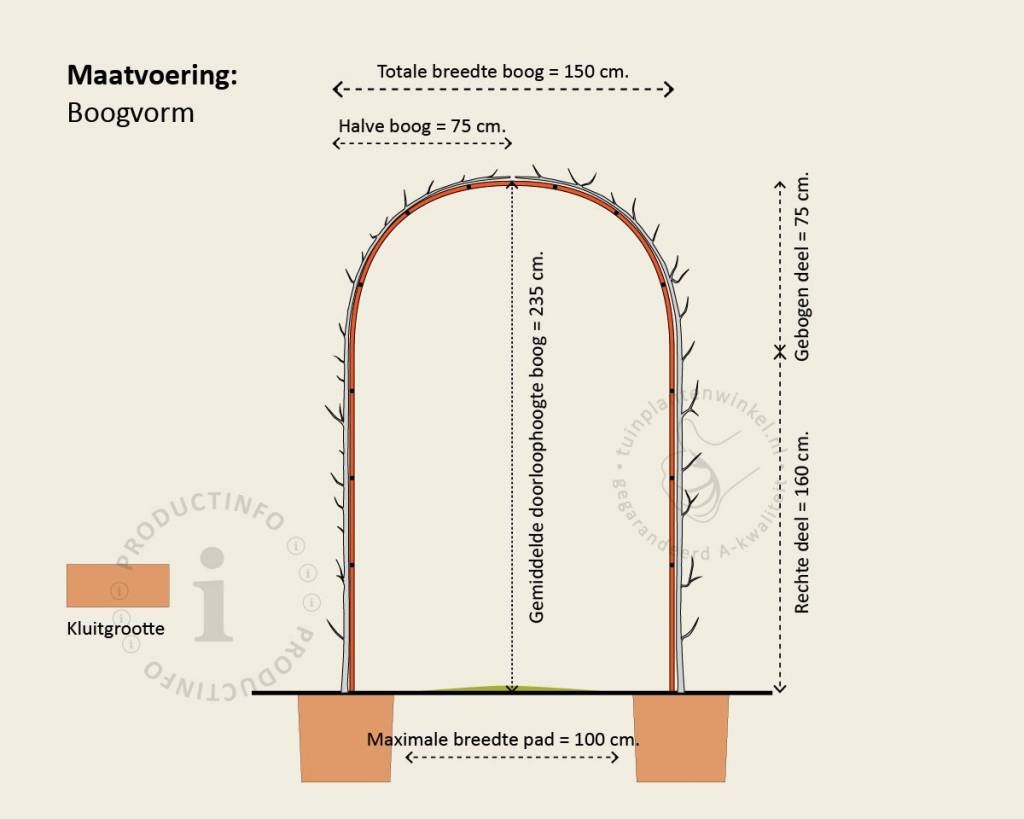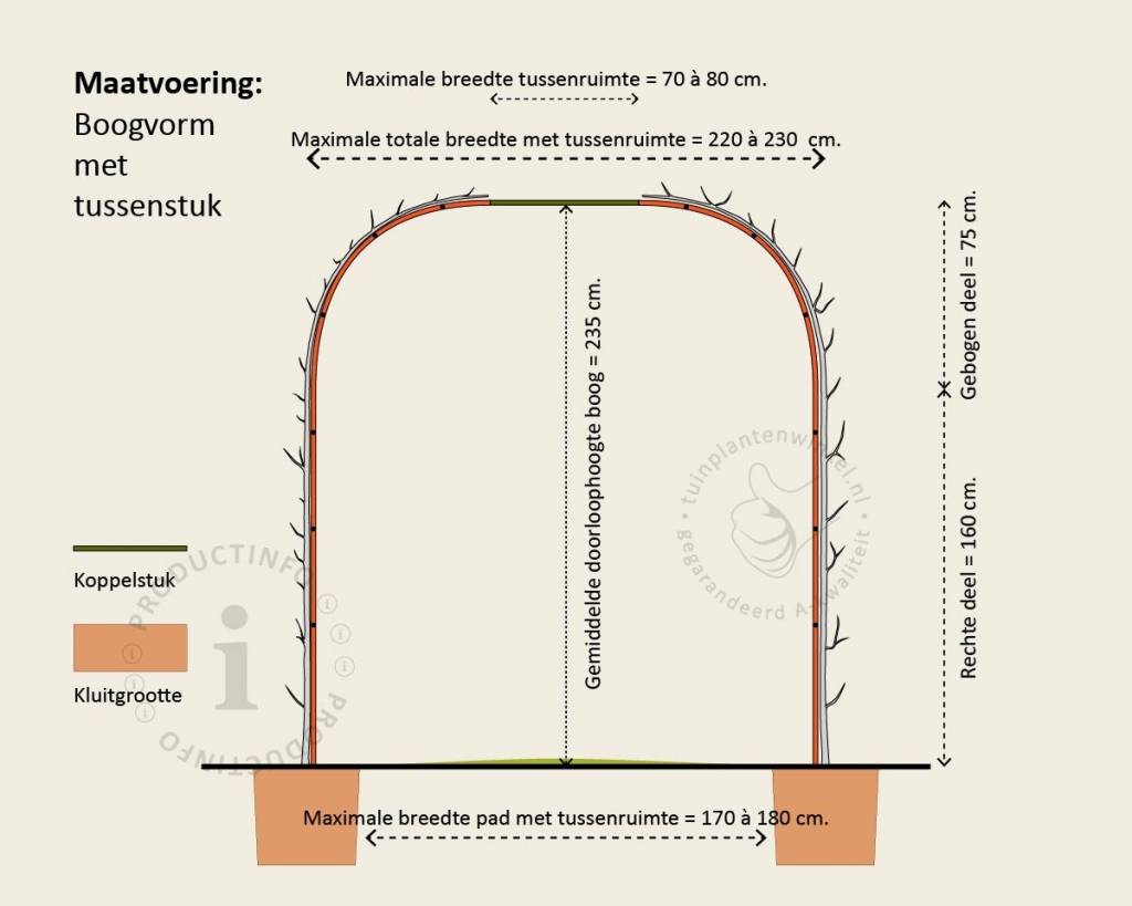 De boogvorm van Tuinplantenwinkel.nl heeft een doorloophoogte van 235 centimeter. De boog bestaat uit twee delen. Hierdoor is deze makkelijk te plaatsen. In een rij geplaatst over een pad ontstaat een soort tunnel. De maximale breedte van een verhard pad bij een standaard boog zonder tussenstuk is ongeveer 100 centimeter. Dit heeft te maken met de kluit van de bomen. De kluit heeft ruimte nodig, waardoor de stam van de boom een stukje van het pad af komt te staan. Als u een breder pad heeft en toch een boog wilt plaatsen, is het mogelijk om de halve bogen verder uit elkaar te zetten. De rekken kunt u vervolgens koppelen met bamboestokken, die u als extra optie kunt bestellen bij dit product. In de afbeeldingen wordt dit schematisch weergegeven. Als u de halve bogen uit elkaar plaatst en heeft gekoppeld met de bamboestokken, kunt u hieraan de takken die ontstaan tijdens de groei verder aanbinden. De twee halve bogen zullen snel naar elkaar toe groeien en één geheel vormen.