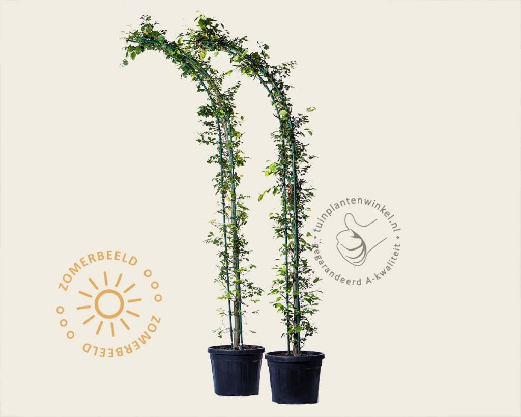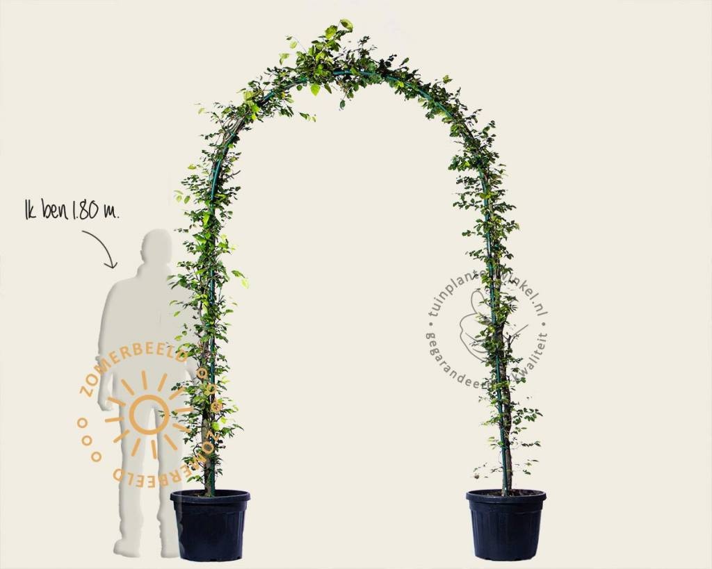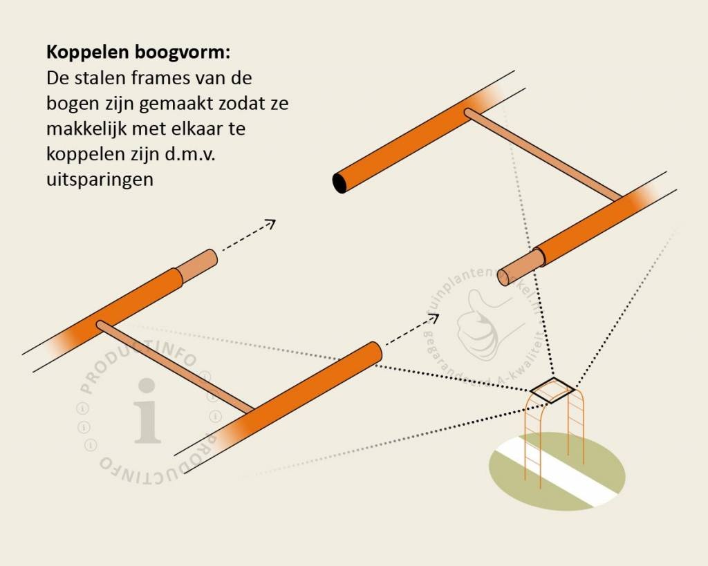 De boogvorm van Tuinplantenwinkel.nl heeft een doorloophoogte van 235 centimeter. De boog bestaat uit twee delen. Hierdoor is deze makkelijk te plaatsen. In een rij geplaatst over een pad ontstaat een soort tunnel. De maximale breedte van een verhard pad bij een standaard boog zonder tussenstuk is ongeveer 100 centimeter. Dit heeft te maken met de kluit van de bomen. De kluit heeft ruimte nodig, waardoor de stam van de boom een stukje van het pad af komt te staan. Als u een breder pad heeft en toch een boog wilt plaatsen, is het mogelijk om de halve bogen verder uit elkaar te zetten. De rekken kunt u vervolgens koppelen met bamboestokken, die u als extra optie kunt bestellen bij dit product. In de afbeeldingen wordt dit schematisch weergegeven. Als u de halve bogen uit elkaar plaatst en heeft gekoppeld met de bamboestokken, kunt u hieraan de takken die ontstaan tijdens de groei verder aanbinden. De twee halve bogen zullen snel naar elkaar toe groeien en één geheel vormen.