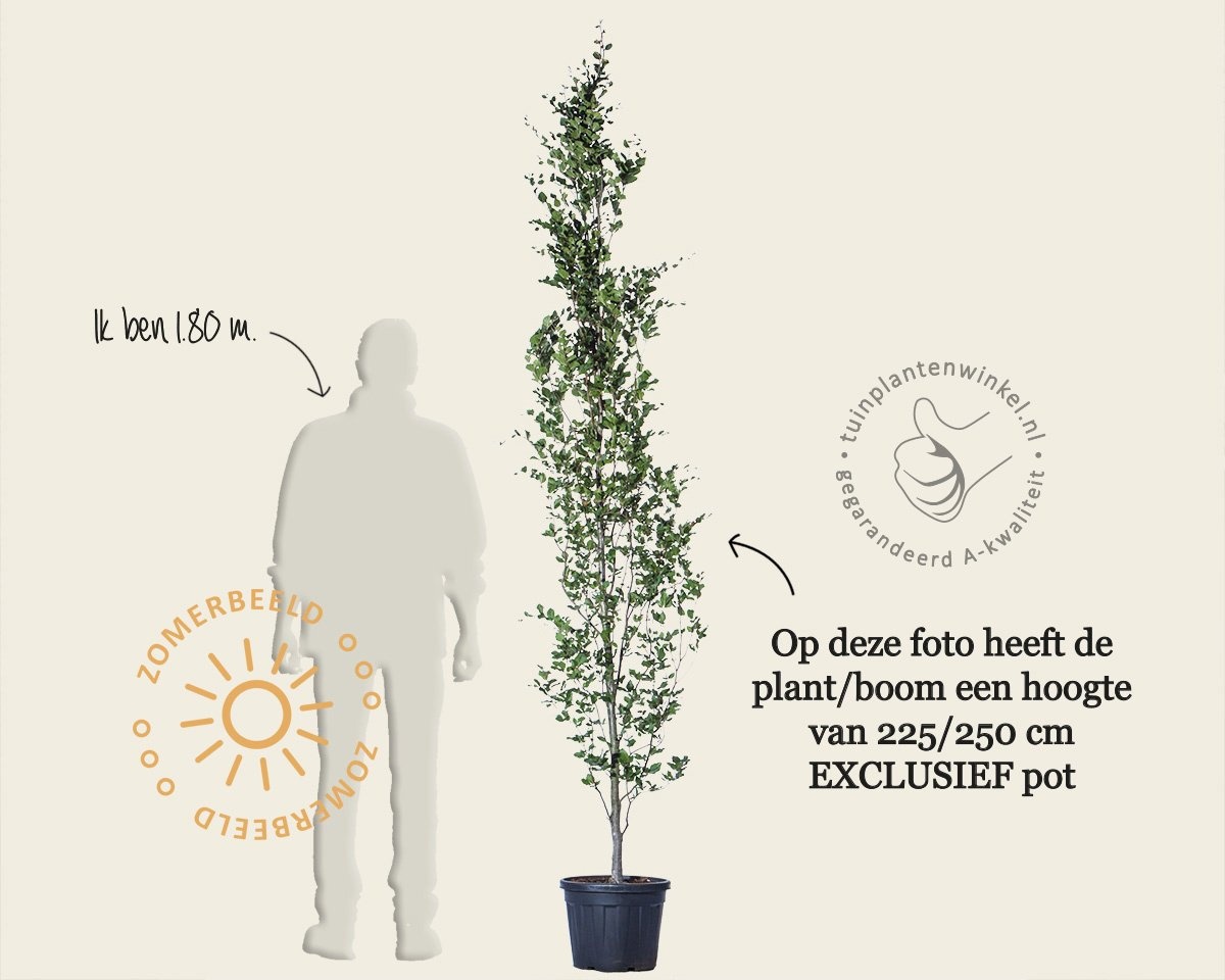 Antwoord: Afhankelijk van de standplaats en de juiste verzorging kan de Zuilbeuk, Fagus sylvatica Dawyck ca. 5 - 10 meter hoog worden.