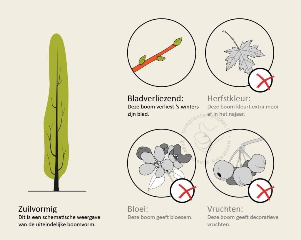 De vertakking begint laag bij deze boom maar in de loop van de tijd kunt u de onderste takken verwijderen zodat een hoogstam boom ontstaat. De zuilvormige groeiwijze ontstaat vanzelf; u hoeft hem niet te snoeien. Als u dat toch wilt, om eventueel een strakkere vorm te creëren, dan verdraagt Rode zuilbeuk dat prima. Wij adviseren in de winter op een vorstvrije dag te snoeien. Er is ook een groen variant de Zuilbeuk, Fagus sylvatica 'Dawyck'. Deze boom heeft glimmend donkergroen blad. Ook deze boom kunt u online bestellen en uw bestelling bezorgd onze eigen bezorgdienst netjes en veilig bij u thuis. Deze boom word niet als haagplant aangeplant, de groene zuilbeuk valt niet onder de haagplanten maar is een solitaire boom of kan als laantje aan geplant worden. Deze boom houd van voedzame humusrijke grond dan zal hij mooi fris uitgroeien.